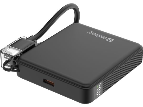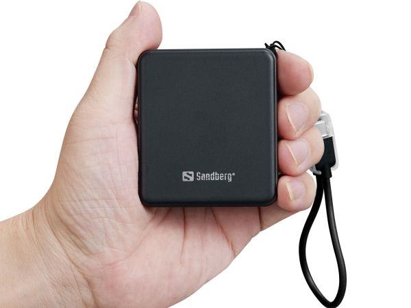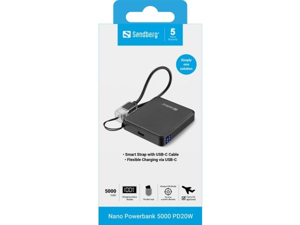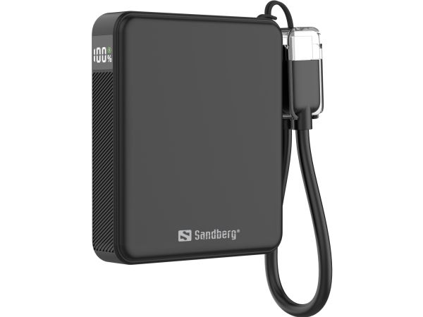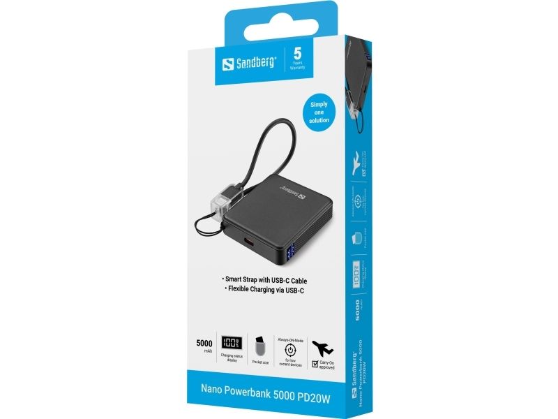 Sandberg Nano Powerbank 5000 PD20W is your super handy backup when your phone is about to run out. With 5000 mAh, you have just the extra charge you need to get most smartphones fully charged to 100%. The included USB-C cable can be used as a practical strap, so you always have it right at hand. The fast 20W charging ensures you can quickly move on, and the digital display gives you an exact status of the battery level. Its pocket size makes it ideal for everyday use, travel, and emergencies.
