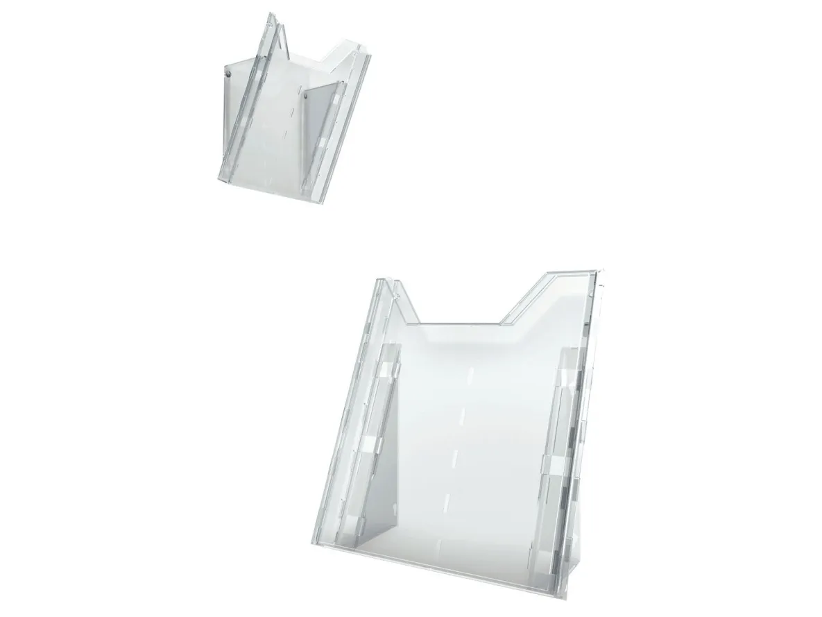 Kombinera det som passar dig med den utbyggda smarta och multifunktionella COMBIBOXX-serien. Blankettfack av transparent plast för förvaring av broschyrer eller annan information i format A4 och 1/3 A4. Facken kan placeras stående på bordet eller sättas upp på väggen genom att vända på bakstycket. Finns i set eller kan byggas ihop efter behov. Bruksanvisningar och skruvar för väggmontering ingår. Singelfack med frontskiva för A4-format. Facket är något bredare (240mm) än A4, så att även mappar för A4-format får plats. Max kapacitet: 24mm tjocka buntar. Kan användas som bords- eller väggställ.