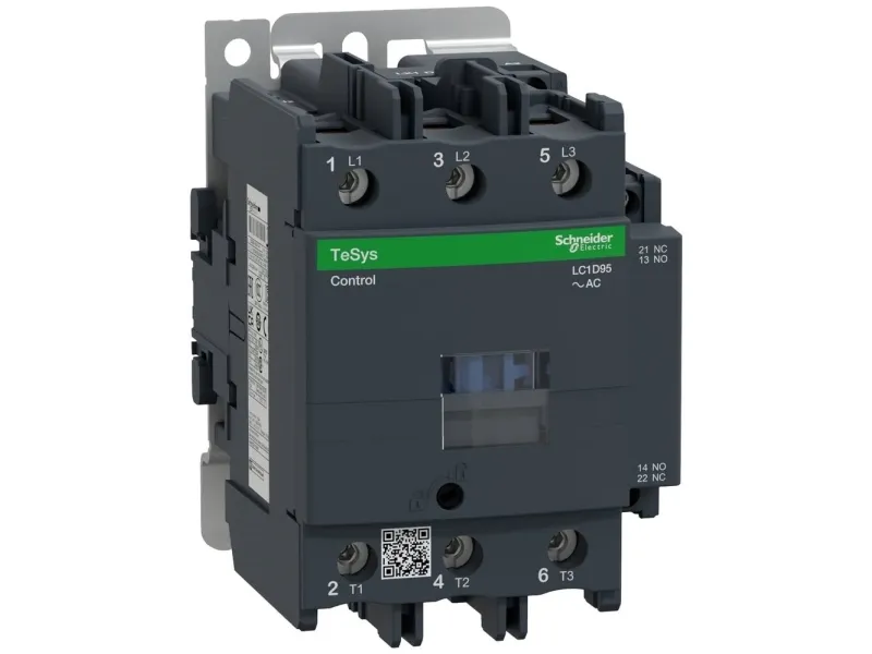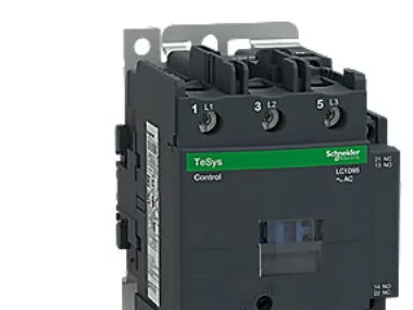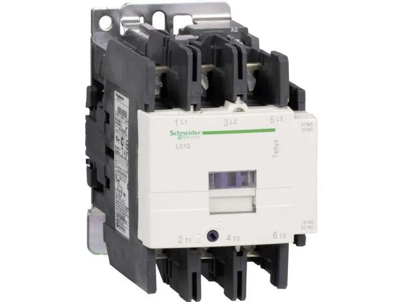 Kontaktorer og reverseringer TeSys serie D 9_150 A Kontaktor til motordrift og til ikke induktive belastninger LC1-D.Typenr: LC1Dxx, hvor xx står for mærkestrømmen og .. For spændingskoden. Der er altid i TeSyskontaktorer 1sl + 1 br. Mærkestrømmen i AC3 drift, 440V: fra 9 til 150 A. Max. mærkeeffekt for 3 fasede standardmotore i AC3 380/400V: fra 4 til 75 kW.Max strøm i AC-1 drift, 3 og 4 polede kontaktorer: fra 25 til 200 A. Clipsbare hjælpekontakter,se under tilbehør.Spolespændinger: AC fra 24V til 660V ;DC fra 12v til 440V. Skrueløse klemmer: tilføj et 3 tal før spændingskoden, for eksempel: LC1D123B7: 12A 24 VAC kontaktor med skrueløse klemmer.Andre spændinger en det viste udvalg på forespørgelse.