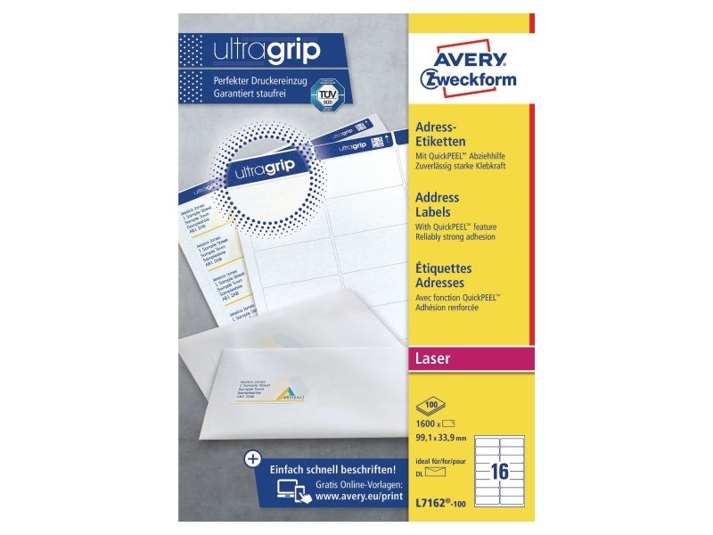 Adressetiketter, Avery L7162-100, 99,1 x 33,9 mm, 16 st per ark, 100 ark
