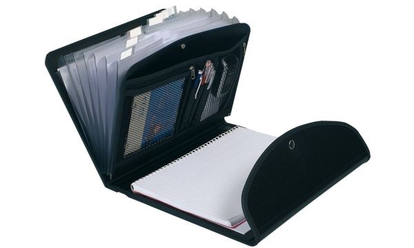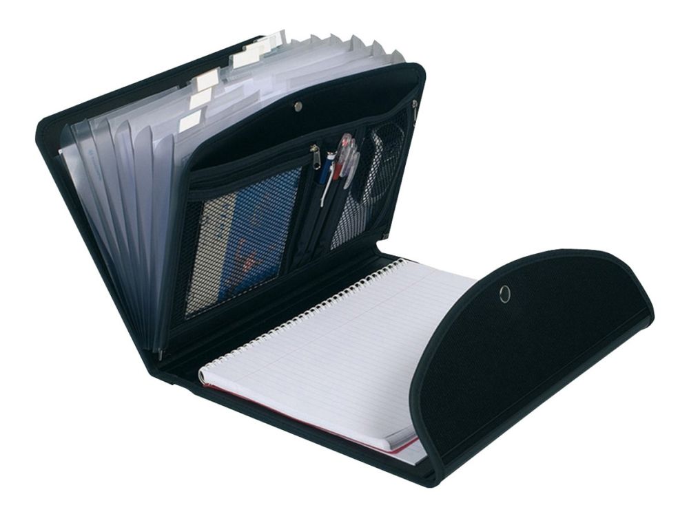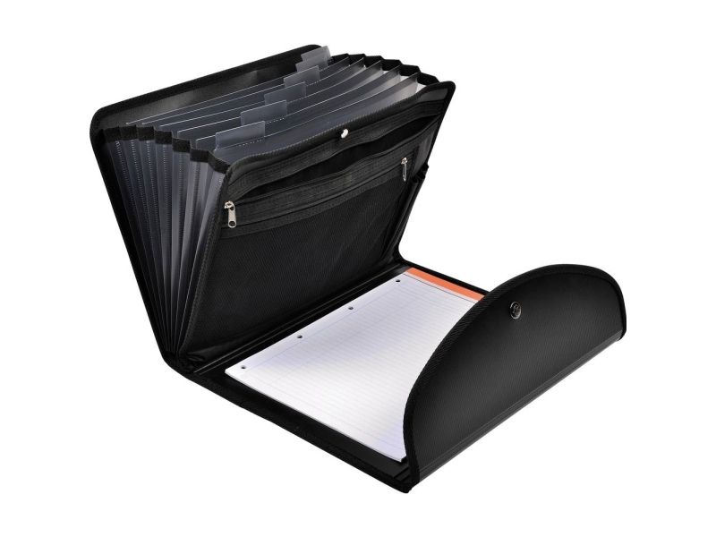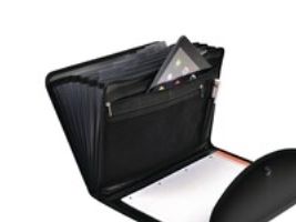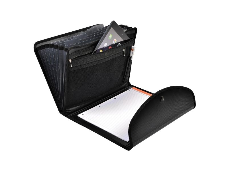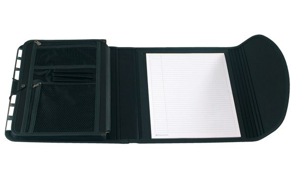 Indvendigt er der en A4-blok, 2 lynlåslommer til tablet, penne, telefon m.m. og 6 harmonikalommer.