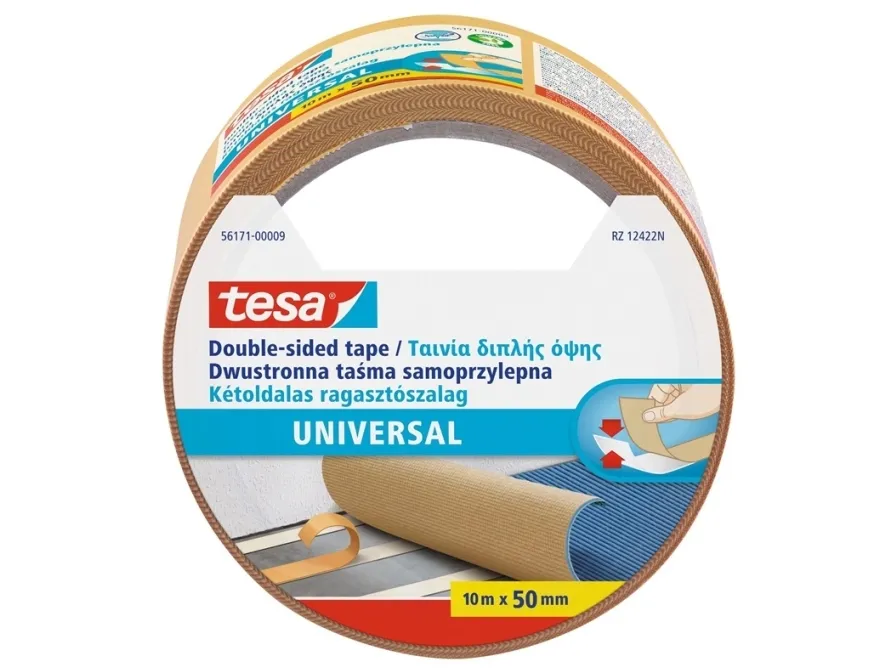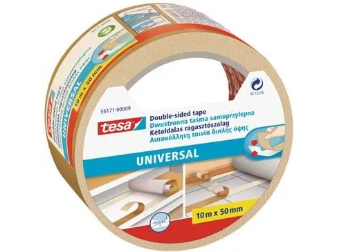 tesa® Double-sided Tape Universal is a highly versatile double-sided tape that matches a wide range of applications like floor laying, handicraft and home decoration. It is able to attach all types of materials, provided they have a sufficiently firm, flat and smooth surface. The tape features a plastic foil that can easily be torn by hand for fast and easy application. It offers strong adhesion and can be used for the permanent fixation of different materials.\n\n- Multi-functional: For fixing carpets on different surfaces, for handicrafts and decorating\n- Tearable by hand\n- Foil quality\n\nEasy handling meets reliable adhesion\n\ntesa® Double-sided Tape Universal offers secure and reliable adhesion on many flat and smooth surfaces. The tape can easily be torn by hand to support easy handling without the need of any tools. Yet it provides superior adhesive powers to guarantee permanent fixation\n\nExcellent qualities as a carpet tape\n\nFor fast and easy carpet laying, simply stick multiple strips of tesa® Double-sided Tape Universal onto the floor. To ensure perfect adhesion, make sure that the floor is dry and absolutely free from dust. After removing the protective covering, you only need to roll out the carpet and can rest assured that it will be fixed permanently. Make sure to stick an uninterrupted strip of the tape along all sides of the carpet to ensure perfect adhesion from wall to wall. This double sided sticky tape is also ideal for fixing rugs.\n\nMulti functional double sided handicraft tape\n\nFor many handicraft applications tesa® Double-sided Tape Universal is the fast and easy alternative to using glue. It is a multifunctional double-sided tape that can be used in combination with many materials that have a flat, dry and sufficiently smooth surface. This also makes it an ideal fixing tape to permanently attach lightweight decorative objects onto the wall.\n\nReady for small and big jobs\n\ntesa® Double-sided Tape Universal has a width of 50 mm and comes in rolls with 5, 10 or 25 meters of tape. While the smaller roll might be ideal for crafting and decorating, the bigger rolls are ideal for carpet laying.