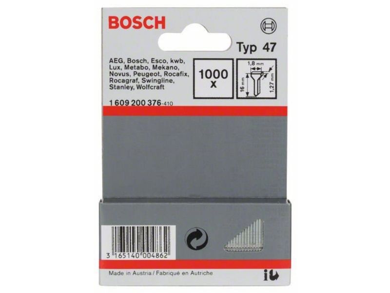 The Nails, Type 47, are for tacking thin and thick materials. They are made of hard steel wire with lengths between 16 and 30 mm. The width of head depends on the machine, either 1.8 or 2.8 mm. They are suitable for use with tackers from AEG, Bosch, Esco, Kwb, Lux, Mekano, Metabo, Novus, Peugeot, Rocafix, Rocagraf, Stanley, Swingline and Wolfcraft.