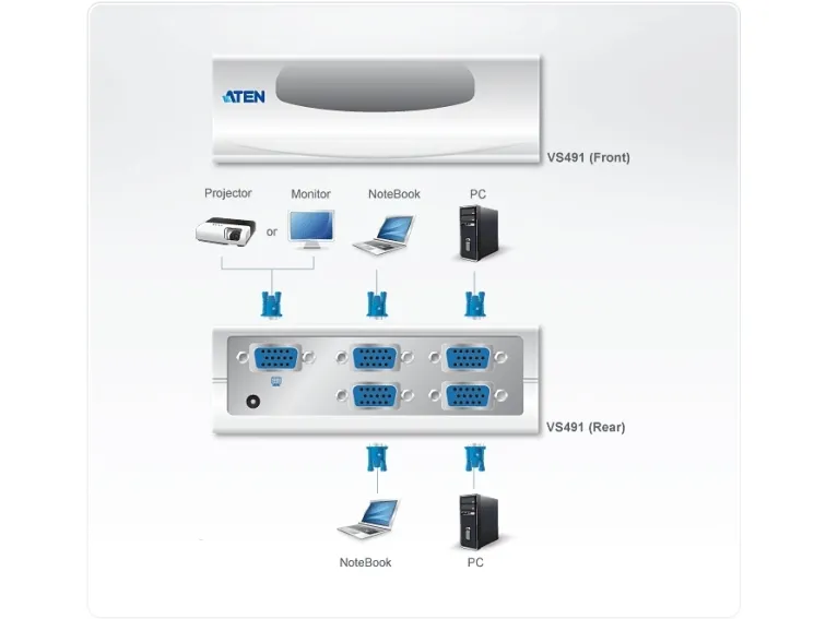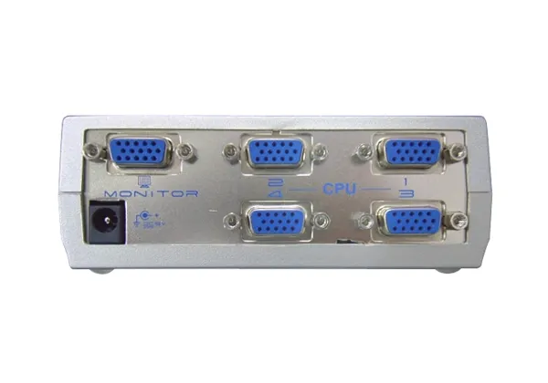 Features - Displays the video output of four computers on a single monitor or projector. - Computer selection via pushbutton switch. - Electronic switching for greater reliability and durability. - Easy Installation - No Software Required. - Long distance transmission - up to 10m - High resolution video - up to 1920 x 1440. - DDC, DDC2, DDC2B Compatible. - Supports VGA, XGA. SVGA, UXGA and Multisync monitors. - OS Support: Windows 2000, Windows XP, Linux, Mac and Sun