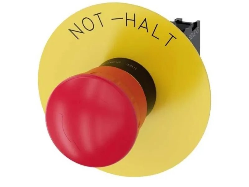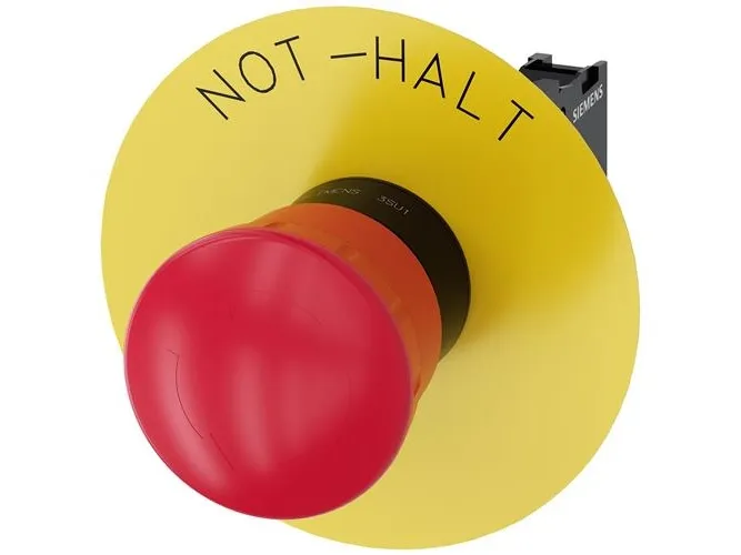 EMERGENCY STOP mushroom-type actuator, 22 mm, round, plastic, red, 40 mm, positive latching, according to EN ISO 13850, rotate-to-unlatch, with yellow backing plate, inscription: NOT-HALT, with holder, 1 NC, screw terminal EMERGENCY STOP mushroom pushbuttons SIRIUS ACT in accordance with EN ISO 13850 for controlling safety-related applications, cannot be overruled.