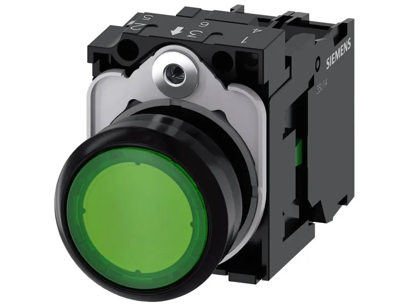 Illuminated pushbutton, 22 mm, round, plastic, green, pushbutton, flat, momentary contact type, with holder, 1 NO, LED module with integrated LED 24 V AC/DC, screw terminal Illuminated pushbuttons SIRIUS ACT for switching and controlling electrical loads.