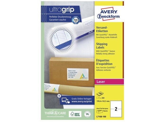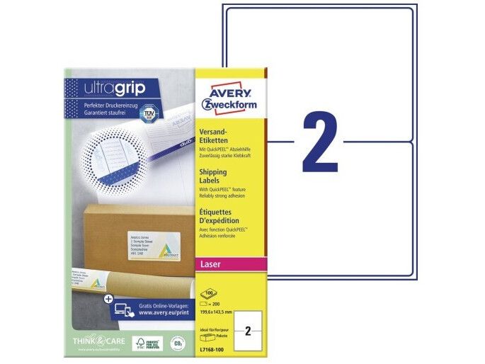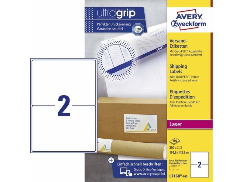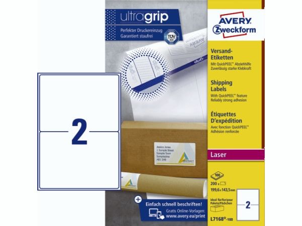 Giv dine pakker og breve et professionelt udtryk ved at bruge Avery pakke-etiketter. Avery's L7168-100 pakke-etiketter med QuickPEEL™ & Ultragrip har 2 etiketter/ark og 200 etiketter/pk, og er fremstillet i et højkvalitetsmateriale, der holder til hele turen.
