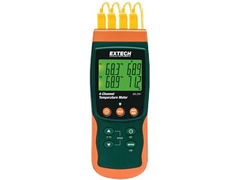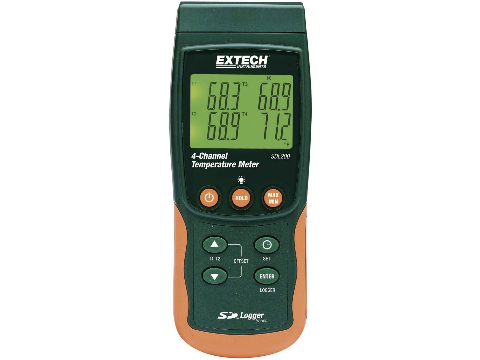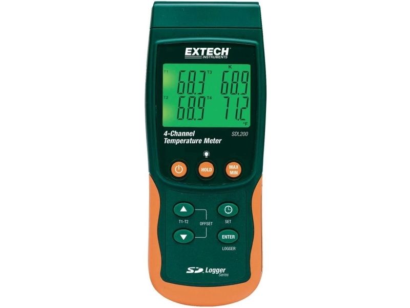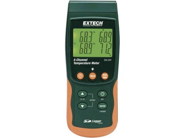 2-/4-kanals-temperaturmåler SDL200Datalogger med dato- og tidsstempel gemmer målinger på et SD-kort i Excel® -format til nem overførsel til en computer · Automatisk-/manuel-logging · Visning af T1, T2, T3, T4 eller T1 - T2 · Indstillelig loggerintervall: 1 - 3600 s · Manuel lagring/hentning af op til 99 datasæt · Min.-/maks.-funktion · SD-kortlæser og intern hukommelser til måleværdier · Måling af relativværdi · Automatisk afbryder, deaktiverbar · Integreret RS-232-interface · Mulighed for drift med strømforsyning som ekstraudstyr. SDL200 muliggør måling og lagring med op til fire termoelementer (type K, J, T, E, R, S), for eksempel to Pt100 modstandsfølere. De registrerede måleværdier gemmes på et SD-kort. Dette muliggør en nem overførsel af data til en computer. 4 kanaler med termoelementer (J,K,E,T,R,S) 2 kanaler med Pt100-prober Integreret datalogger til 20 000 måledata på 2 GB SD-kort 4-delt v