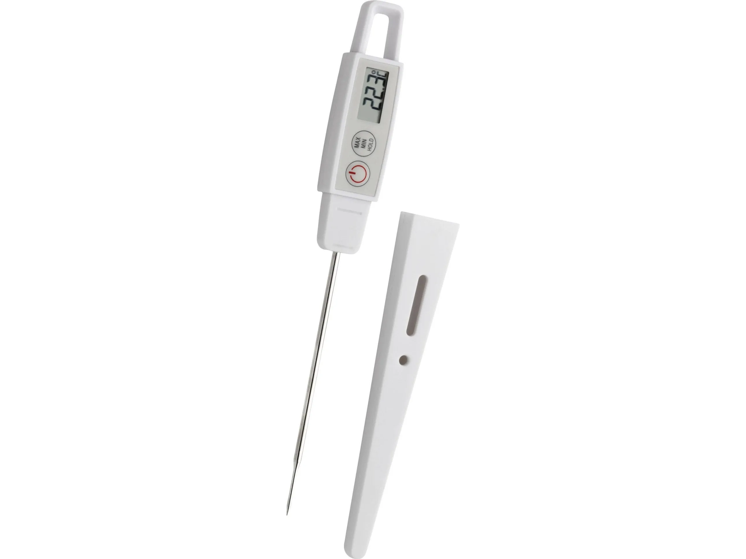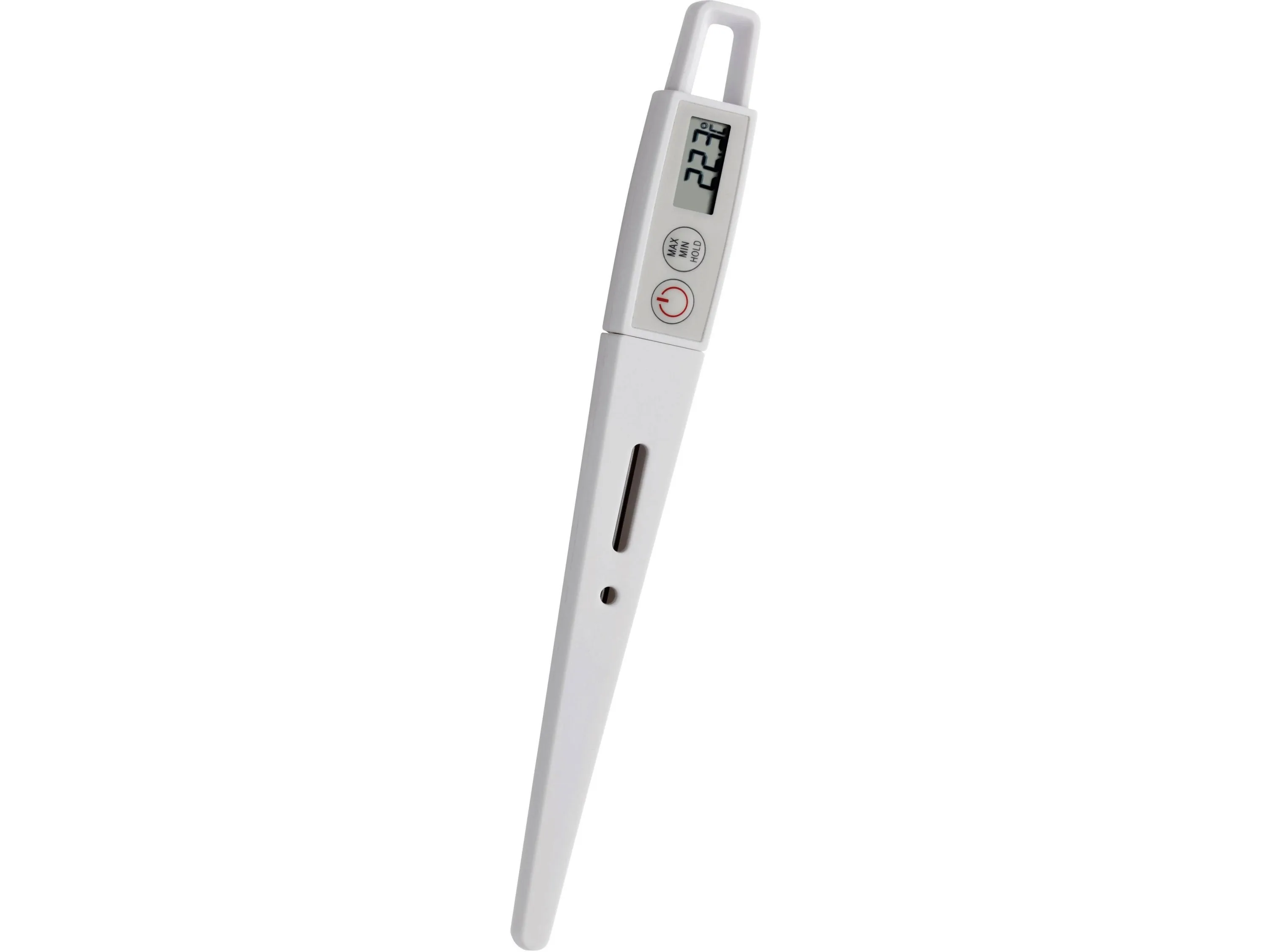 - ON-/OFF switch,\n- hold-, max.-min.-function with dynamic update,\n- T90 measuring time about 8 sec.,\n- automatic switch off with long term measurement function,\n- calibratable,waterproof according to IP67 standard,\n- measuring range -40…+250°C,\n- accuracy ±0.5°C at -10…100°C,\n- otherwise ±1°C, (±0.9°F at 14…212°C,\n- otherwise ±1.8°C),\n- reversible °C/°F,\n- in plastic case, with clip,\n- battery LR 44 button cell enclosed\n- 220 x 25 x 20 mm, 50 g, EK-EL