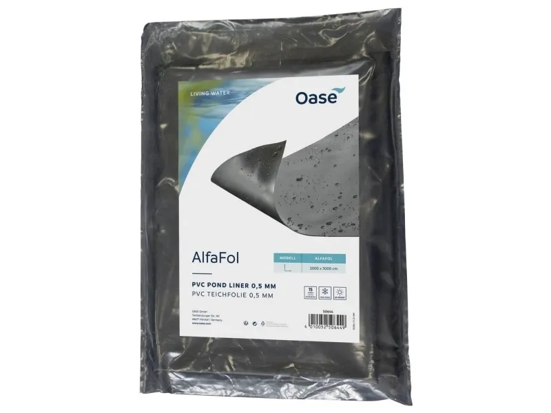 AlfaFol för individuella trädgårdsdammssystem med olika grunda och djupa vattenzoner. Foliebanor kan klippas till med en sax och svetsas ihop utan problem. Den enlagiga, släta, svarta folien av regenererad och kadmiumfri PVC är UV-, svetsfogs-, förruttnelse- och köldtålig enligt DIN 53361 samt rotbeständig. OASE ger 15 års garanti på denna folie och erbjuder en returgaranti för begagnad OASE AlfaFol för miljövänlig återvinning.