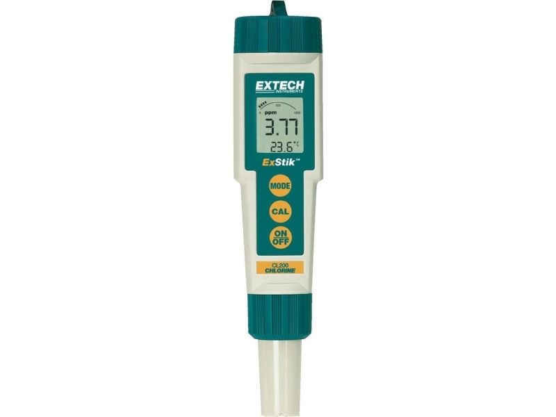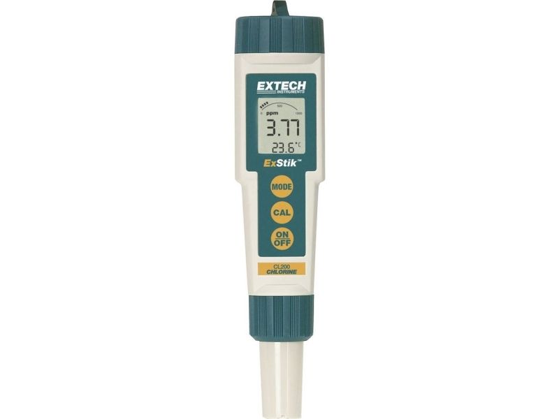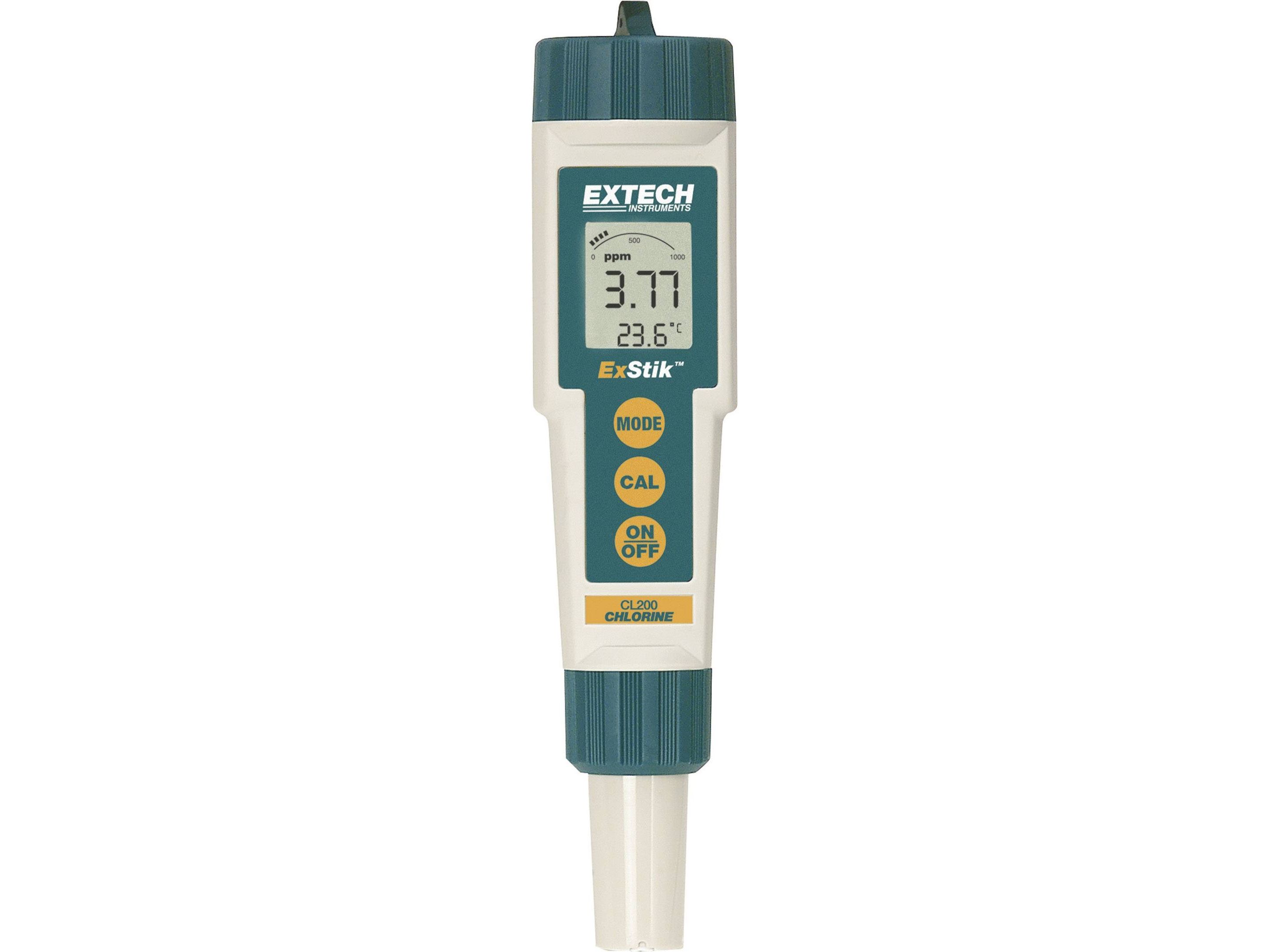 ExStik™ CL200 klormätareMätning av den totala klorhalten i simbassänger etc. - Möjlighet till mätning utan referens - Platt utbytbar elektrod för enkel rengöring - Ytterligare temperaturmätning - Minne för 15 mätvärden. Robust och vattentät (IP67) mätare. Den kompakta mätaren kännetecknas av sin höga noggrannhet och den utbytbara mätelektroden. Förutom den numeriska visningen av det uppmätta värdet är enheten utrustad med en stapeldiagramvisning och en minnesfunktion för 15 mätvärden. Utbytbar elektrod Vattentät (IP67) Minnesfunktion för 15 mätvärden