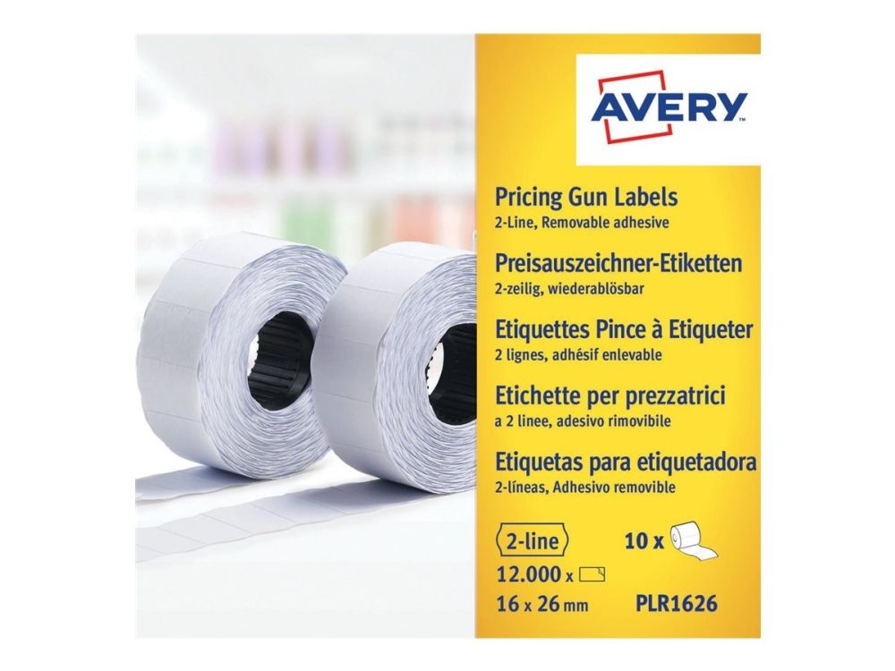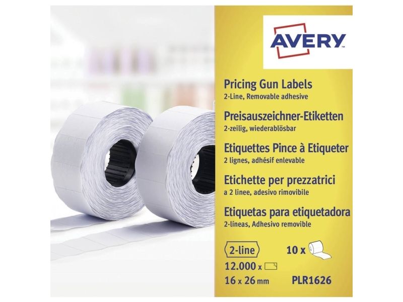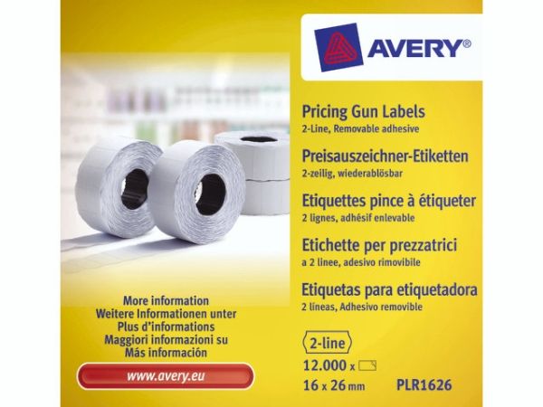 Avery PLR1626 är ett paket med vita avtagbara prisetiketter som passar till Averys 2-radiga prispistol, PL2 18. Prisetiketten har ett avtagbart lim som fäster bra, men kan tas bort lätt och enkelt utan att lämna limrester.