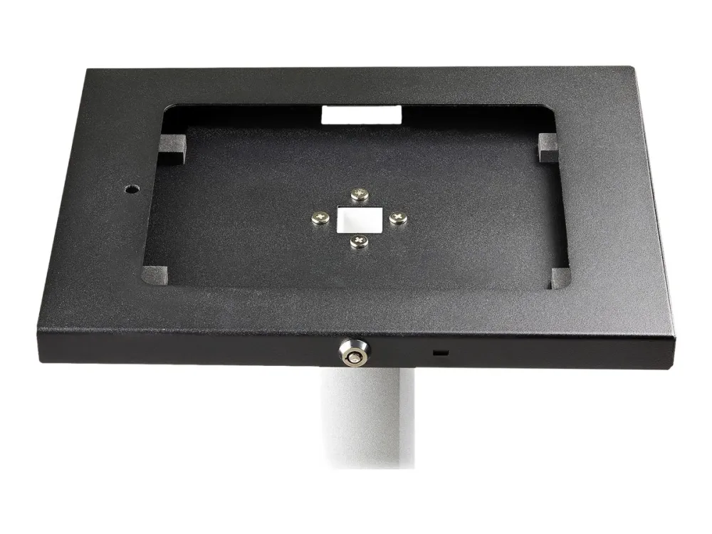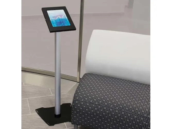 Det säkra surfplattestativet har en låsbar hållare som hjälper till att skydda surfplattan så att den inte försvinner eller skadas. Dessutom kan stativets bas av stål och aluminium skruvas fast i golvet, för att säkra det på plats.