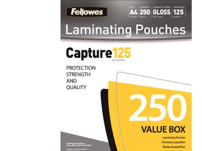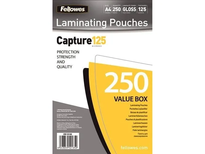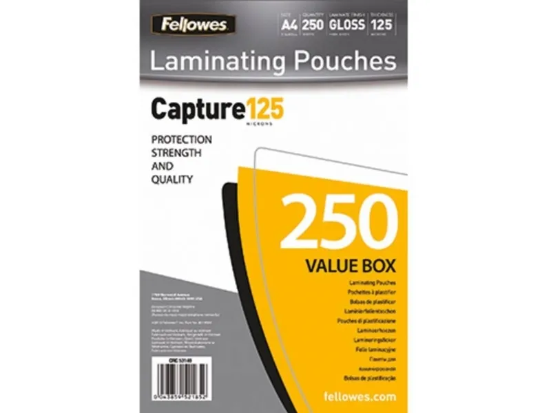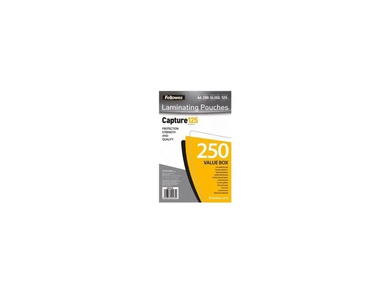 - Capture 125 Micron thickness - providing an advanced level of document protection;\n- Ideal for certificates, instructional materials, signage and frequently handled documents;\n- Gloss finish in A4 size;\n- Pack size of 250;\n- Compatible with all laminator brands.