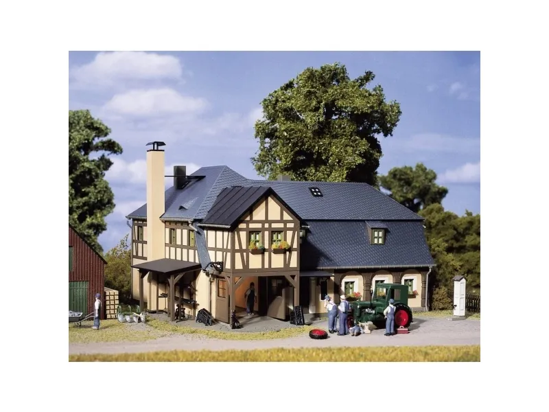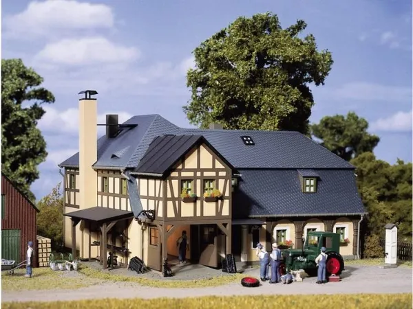 Quaint half-timbered country blacksmith's with many accessories: benches, water pump, roofed store, interior details including shelves, anvil and hearth. A cast-iron lamp and railing ready for delivery add further detail.