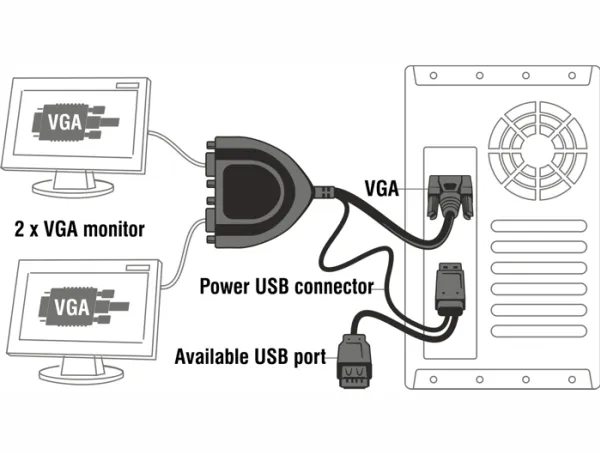 This Delock VGA data splitter can be used to split the video signal from video output of your PC or notebook. Thus you can connect two monitors to one VGA port. Power will be supplied through the USB port without blocking the USB port due to the male - female solution.