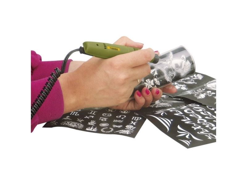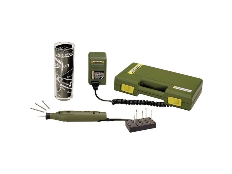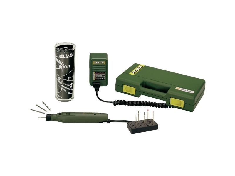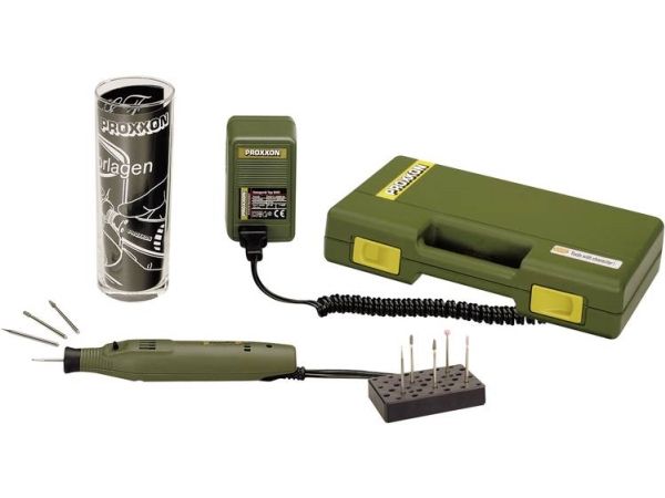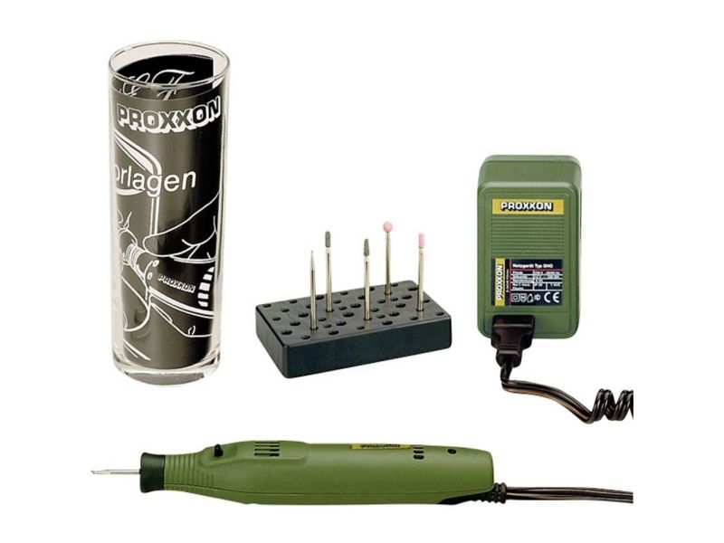 Housing of glass fibre-reinforced POLYAMIDE. Plus mains adapter, trial glass, motifs and instruction booklet as well as all necessary bits: 1.0 and 1.8mm diamond grinding bits with spherical head for engraving and line work, silicon carbide grinding bits in both conical and bullet shape for frosting glass as well as one corundum grinding bit in ball and cylinder shape for grinding and engraving. Including bit holder usable for holding MICROMOT rotating bits. Complete with mains adapter 0.5A.
