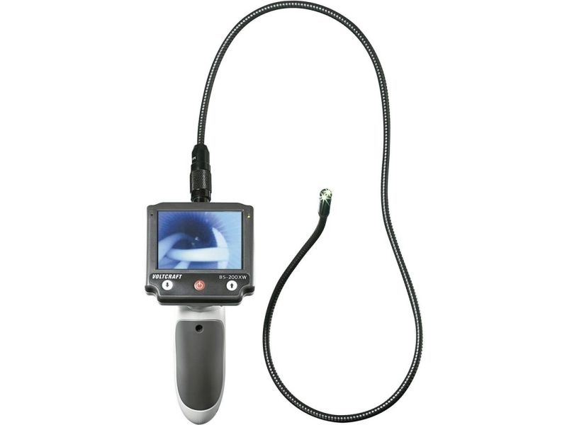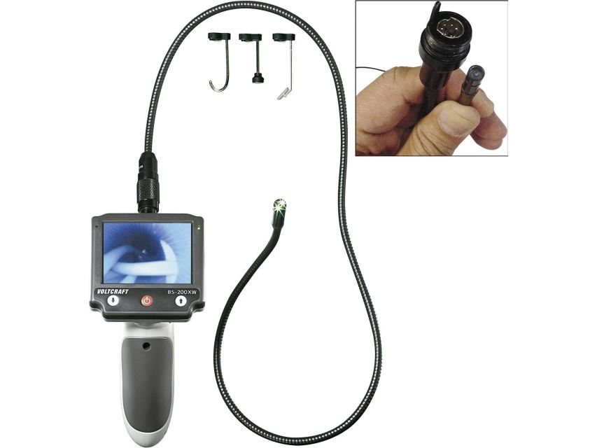 Manuelt endoskop BS-200XWFleksibel 88 cm lang svanehals · Aftagelig LCD-farvemonitor · Vandtæt kamerasonde dia. 8 mm · Tv-udgang. Endoskop med vandtæt 88 cm svanehals til inspektion af hulrum. Det dæmpbare 2-LED-kameralys på det 8 mm kamerahoved sørger for en optimal oplysning. Den aftagelige monitor gør det muligt at anvende endoskopet fleksibelt. På den måde kan du for eksempel give yderligere personer mulighed for at kunne se, hvordan maskiner ser ud indeni, ved at forbinde monitoren med grebet vha. USB-kablet og så sikre et optimalt sigt på displayet uafhængigt af apparatets position. Semifleksibel svanehals Udskiftelige endoskopkameraer Optional forlængelse af kameraets rækkevidde Ergonomisk pistolgreb Med aftagelig monitor med 8,9 cm (3,5) pr. kabel TV-udgang N/A;Sondelængde 88 cm Med redningskroge, s