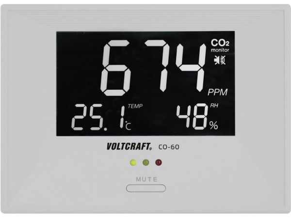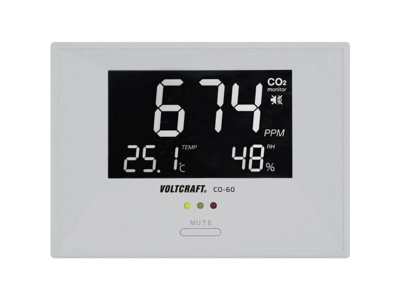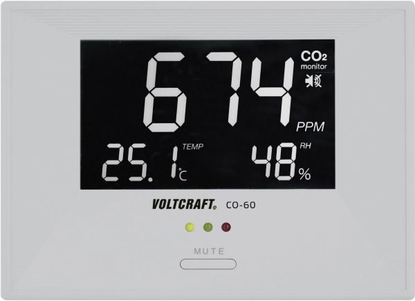 Voltcraft Luftkvalitetsdisplay CO-60Måling afCO2-koncentration, temperatur, luftfugtighed · Luftkvalitetsindikator · Forskellige farver til bestemmelse af indeklimakvalitetenEn dårlig luftkvalitet er den hyppigste årsag til ubehag eller træthed, og den mindsker koncentrations- og præstationsevnen. Grunden til dette er en forhøjet eller en for høj andel af kuldioxid (CO2) i indeklimaet. Tjek de rum, hvor der opholder sig personer, med CO-60. Luftkvaliteten videregives via forskellige LED'er (grøn, gul og rød). Ved overskridelse af den indstillede grænseværdi, udløses en alarm, der signalerer, at nu skal der luftes ud. Ud over målingen afCO2-koncentrationen måler CO-60 den omgivende temperatur og den relative luftfugtighed og viser disse værdier på en overskuelig måde på LED-displayet. Man kan frit vælge at betjene enheden via en USB-tilslutning eller via den medfølgende strømforsyning. Ideel til arbejds- og børneværelser, offentlige bygninger, skoler, kontorer og så videre.