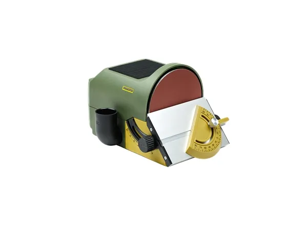 For all wood types, steel, non-ferrous metals, precious metals, plastics (also Plexiglas and glass-fibre reinforced plastics).\n\nPowerful drive and vibration-free running thanks to balanced DC motor. Housing of glass-fibre reinforced POLYAMIDE. Aluminium table tilting downwards through 50°, 10° upwards, with angle stop. Planeturned sanding disc of die-cast aluminium covered with silicone film. This allows for effortless removal of sanding discs after use. Two additional square silicone films offer easy storage after use and thus re-use when needed. Machine can be secured both horizontally (with table) on the workbench, and also quickly and safely in vertical position.\n\nSuction connection and adapter to connect a vacuum cleaner for dust-free working. With each 2 sanding discs grit 80, grit 150 and grit 240.