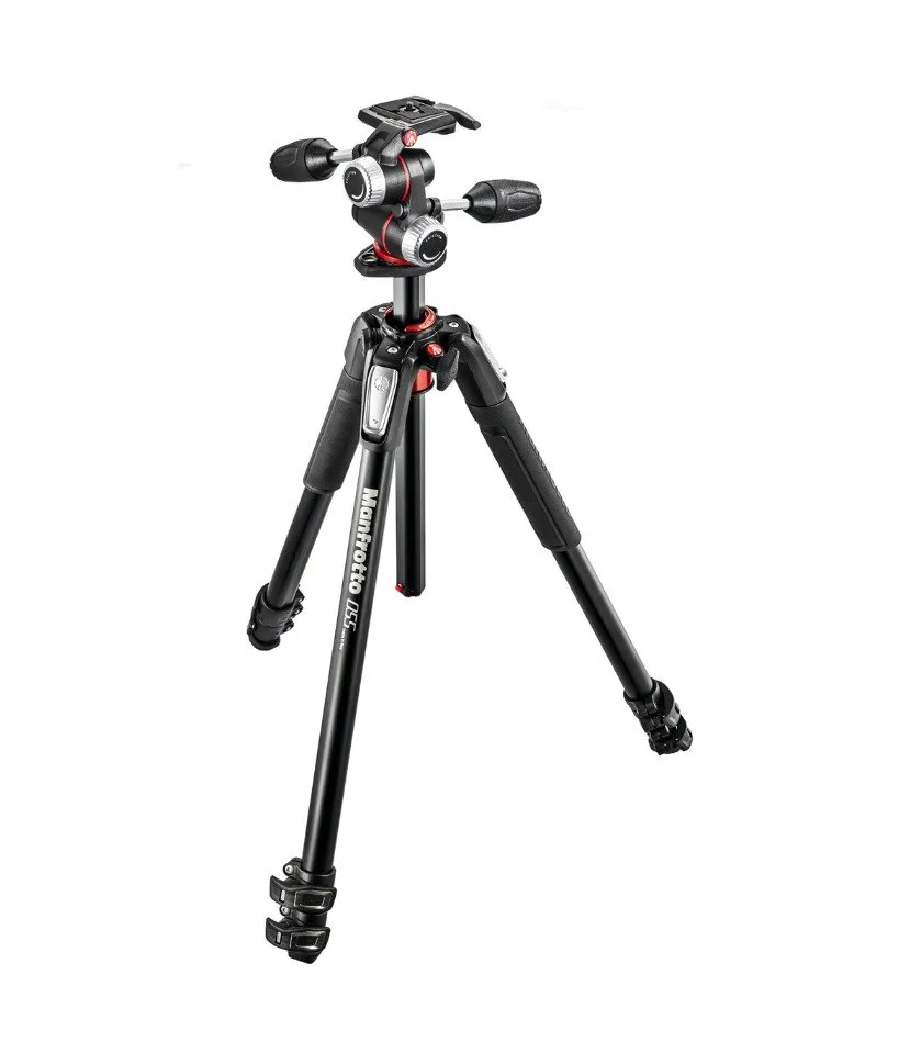 The new 055 aluminium 3-section tripod is also available as a kit with the MHXPRO-3W X-PRO 3-Way Head with quick release camera plate.\n\nThe key feature of the 055XPRO3 is its 90° centre column mechanism, which allows the column to be extended vertically as normal, or horizontally to open up a wide range of framing and shooting possibilities; this makes the 055XPRO3 an extremely versatile tripod, suitable for a wide range of photography and video applications. The horizontal column mechanism is housed within the tripod's top casting for compactness, but it is easily and quickly extended whenever you need it. Switching between vertical and horizontal column orientation requires no disassembly, and can even be done with a camera attached. .\n\nThe legs of the 055XPRO3 tripod are also fast to extend and adjust, thanks to the Quick Power Lock levers that block and unblock each leg section. The special design of the QPL levers allows a more comfortable single-handed opening of all leg sections in one action. QPL’s lever design also offers more powerful locking of each section, meaning the tripod is more stable and rigid than with traditional lever designs. Intuitive and ergonomic leg angle selectors allow each leg to be independently and solidly set to any of the preset angles, again allowing considerable positioning freedom. .\n\nA bubble level is built in to the top of the centre column for precise framing. The bubble level rotates freely around the centre column, so it can be positioned wherever it's easiest for you to see it while adjusting the tripod, and without it either being obscured by the mounted head and camera, or getting in the way of head or camera controls. .\n\nThe top casting of the 055XPRO3 has an Easy Link connector for supporting a photo or video accessory (such as an LED light, flash, reflector, or other piece of equipment) on an extending arm or bracket, and making the tripod into a practical mobile studio. .\n\nThe X-PRO 3-Way Head has retractable levers which make it ultra-compact, and also features new friction controls on the portrait and tilt axes, to help balance the weight of camera equipment so that fine framing adjustments can be made with the locking knobs open, only locking everything down once the shot is ready. .\nThe 055XPRO3 and the X-PRO 3-Way Head are made in Italy by Manfrotto
