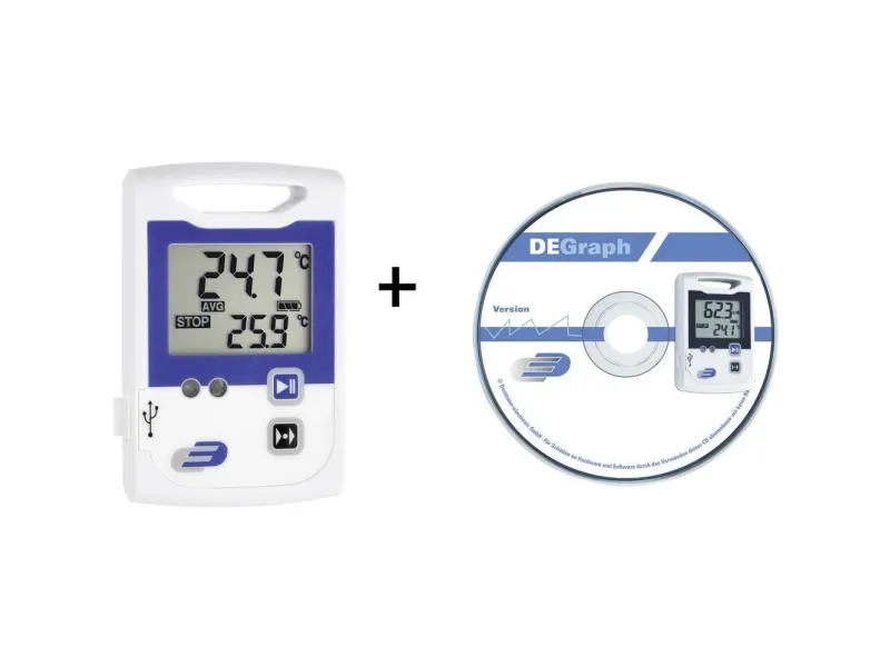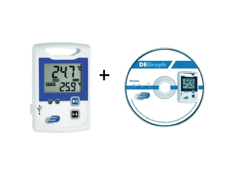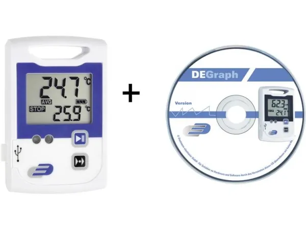 Startpaketet består av datalogger, USB-kabel och Windows-programvara LOG-graph (utan extern temperatursensor).