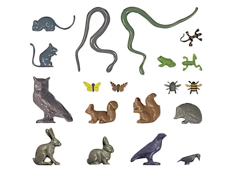 fält-, skogs- och trädgårdsdjur för din egen målning: 8 fjärilar, grodor, råttor, ormar, getter, hamstrar och fiskar vardera, 4 salamandrar och ekorrar vardera och 2 harar, igelkottar, kaniner, kråkor, hackspettar och ugglor vardera.
