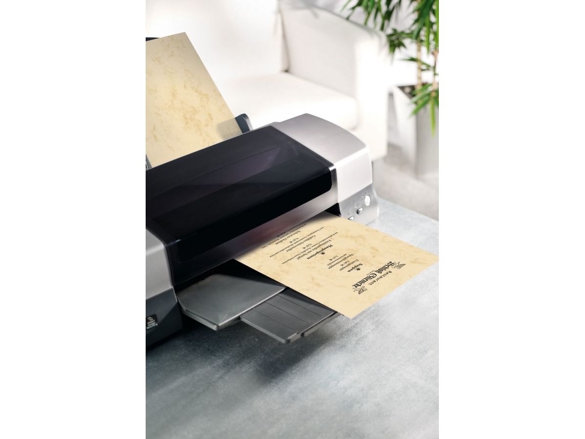 Marbled paper, beige, motif on both sides, 90 gsm fine paper suitable for printing with inkjet and laser printers and copiers. The paper is extremely versatile, e.g. for letters, invitations, menus and notices. Box contents: 25 A4 sheets.