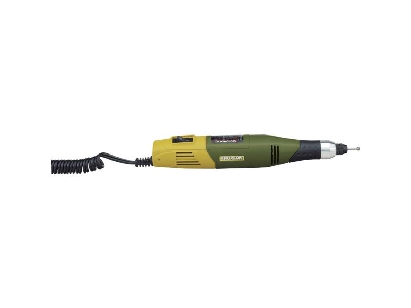 With a diameter of only 35mm it is unsurpassed easy to manage. Besides the weight of only approx. 230g, the effortless drive via balanced motor with ground spindle and collar bearing allows for quiet run with a pleasing sound to the ear. The high-quality MICROMOT steel collets ensure accurate clamping of the cutters, without rattling or vibrating of bits and cutters. The size of the machine dictates a 12V drive system, use of a mains adapter of at least 1.0A is thus required. We recommend MICROMOT mains adapters NG 2/S, NG 2/E or NG 5/E.