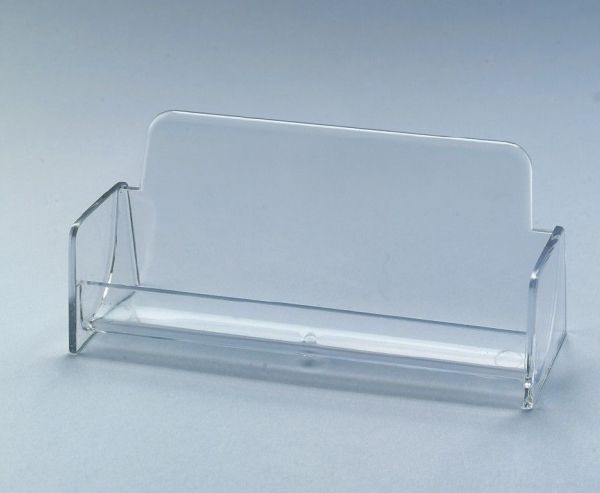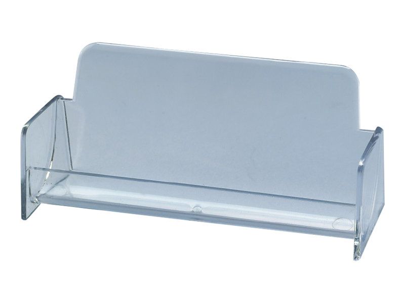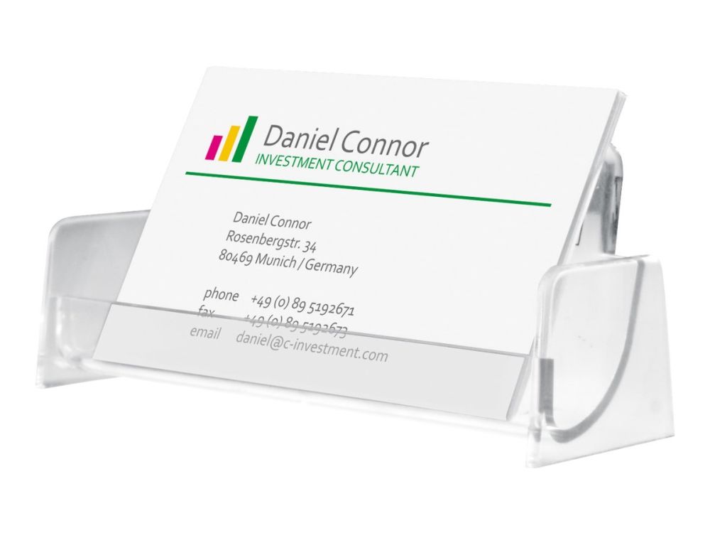Clear business card display stand with one compartment, made of hard plastic. Ideal for the presentation and easy removal of business cards. There is space for up to 50 cards (max. 97 x 85 mm) in the display stand.