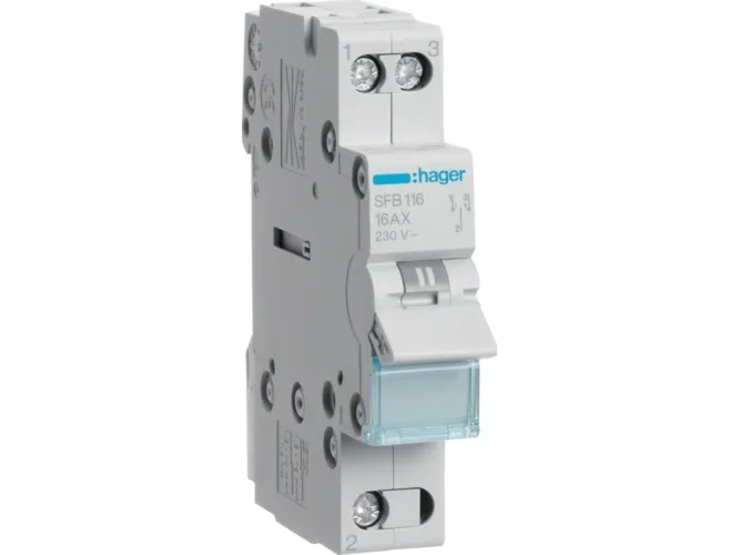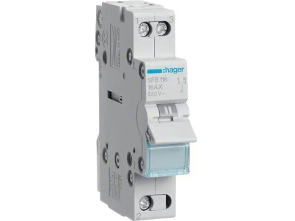 Hager SFB116. Coil voltage: 4000 V, AC input voltage: 400 V, AC input frequency: 50 - 60 Hz. Number of poles: 1P, Product colour: Blue, Grey. Width: 17.5 mm, Depth: 70 mm, Height: 83 mm