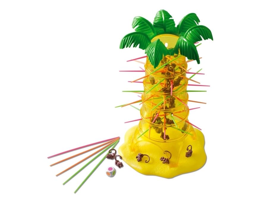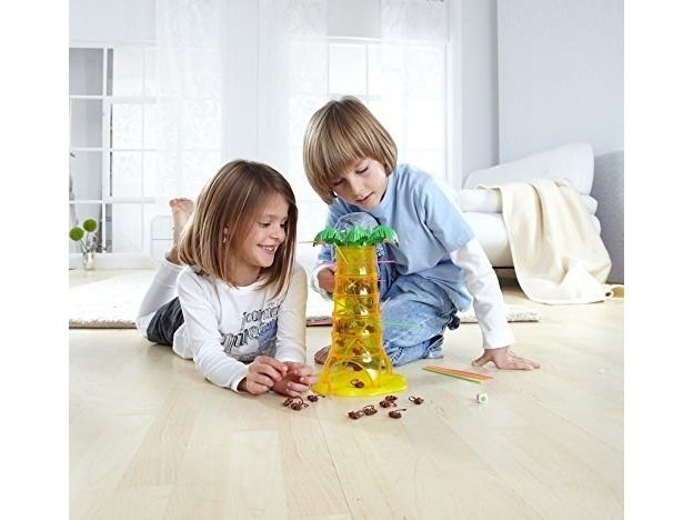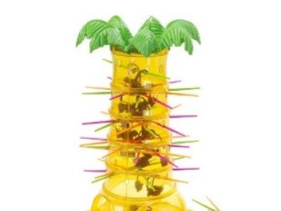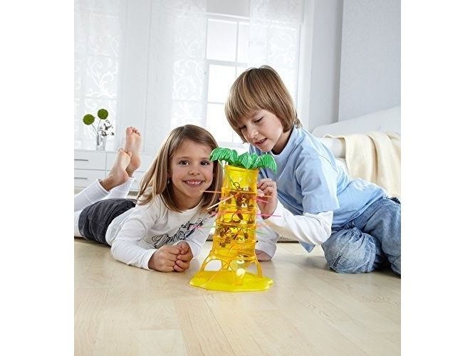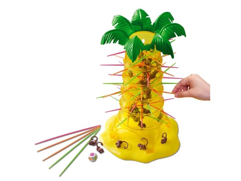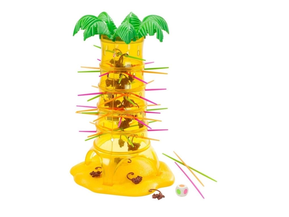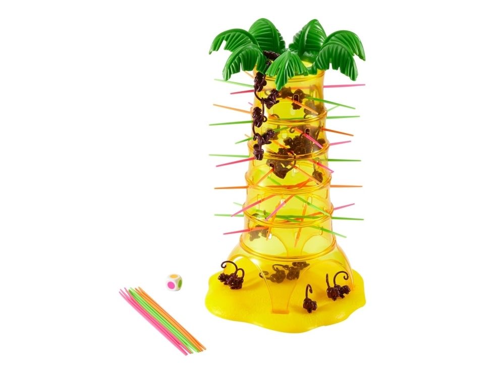Spelet handlar om färdighet och fingerfärdighet och det är enkelt att lära sig och apkul att spela! Målet är att inte låta några apor ramla ner för trädet under din tur. Skapa ett nät av färgade stickor genom trädet och lägg aporna inuti trädet. Slå sedan med tärningen och turas om att ta bort en sticka i taget– i den färg som tärningen anger. Den yngste spelaren börjar spelet. Om alla stickor i en färg har tagits bort och du får den färgen har du tur – då får du hoppa över den omgången! Var försiktig, en felaktig rörelse kan göra att aporna faller ner och då måste du lägga till dem i din hög! Den spelare som har fått minst antal apor att falla vinner! Ingen läsning krävs för att spela Tumblin' Monkeys, så det passar perfekt för mindre barn. Spelet levereras med en klargul genomskinlig plastpalm så att du kan se aporna vrida sig när du försöker fånga deras svansar på plaststickorna. Dessutom ingår 30 apor, 30 stickor i olika färger och en speciell tärning. För 2–4 spelare.