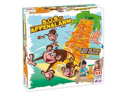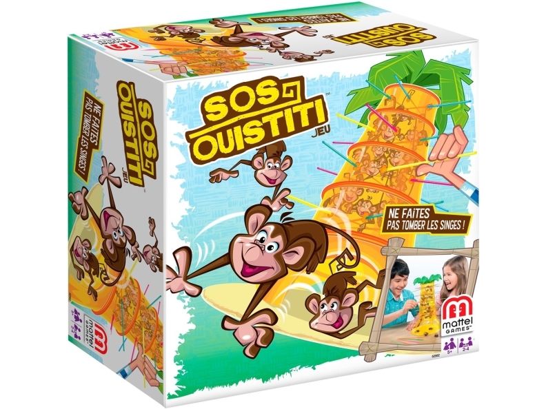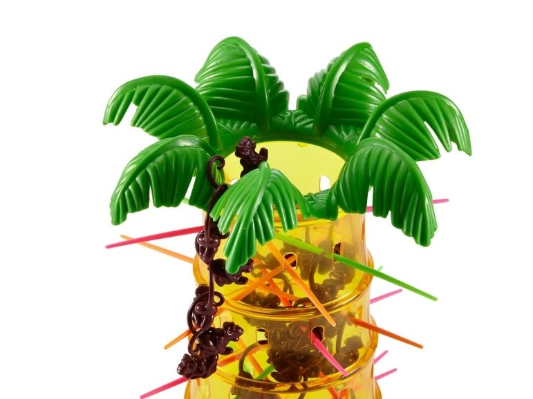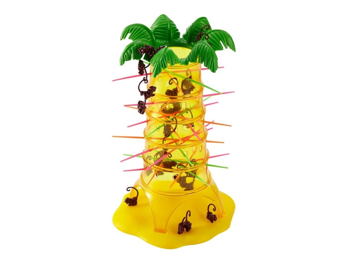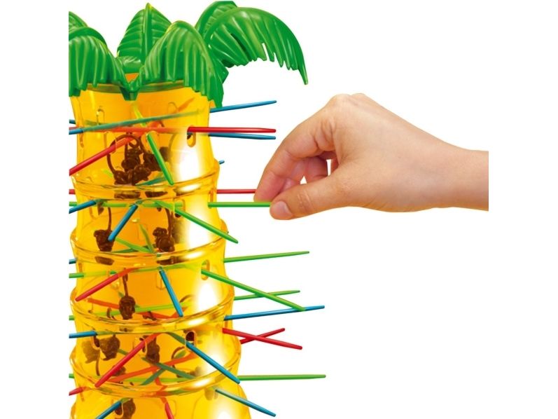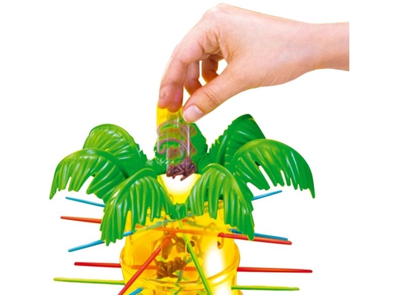 Spelet handlar om färdighet och fingerfärdighet och det är enkelt att lära sig och apkul att spela! Målet är att inte låta några apor ramla ner för trädet under din tur. Skapa ett nät av färgade stickor genom trädet och lägg aporna inuti trädet. Slå sedan med tärningen och turas om att ta bort en sticka i taget– i den färg som tärningen anger. Den yngste spelaren börjar spelet. Om alla stickor i en färg har tagits bort och du får den färgen har du tur – då får du hoppa över den omgången! Var försiktig, en felaktig rörelse kan göra att aporna faller ner och då måste du lägga till dem i din hög! Den spelare som har fått minst antal apor att falla vinner! Ingen läsning krävs för att spela Tumblin' Monkeys, så det passar perfekt för mindre barn. Spelet levereras med en klargul genomskinlig plastpalm så att du kan se aporna vrida sig när du försöker fånga deras svansar på plaststickorna. Dessutom ingår 30 apor, 30 stickor i olika färger och en speciell tärning. För 2–4 spelare.