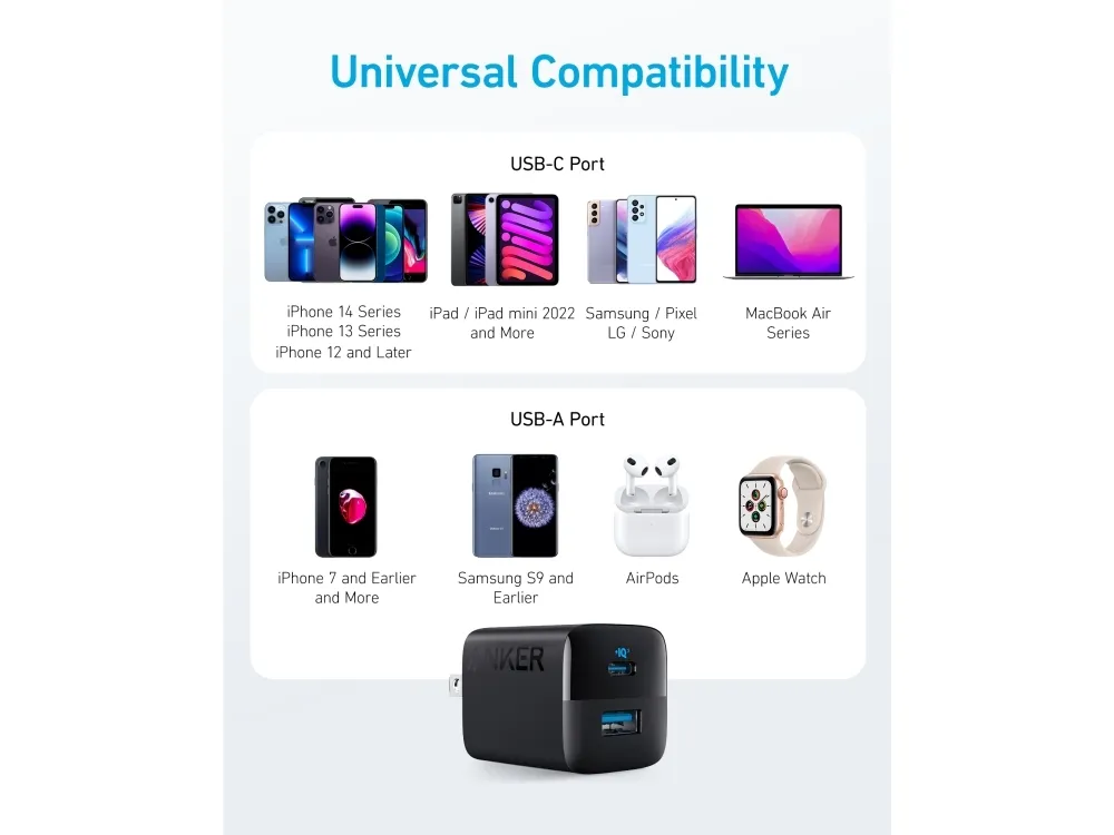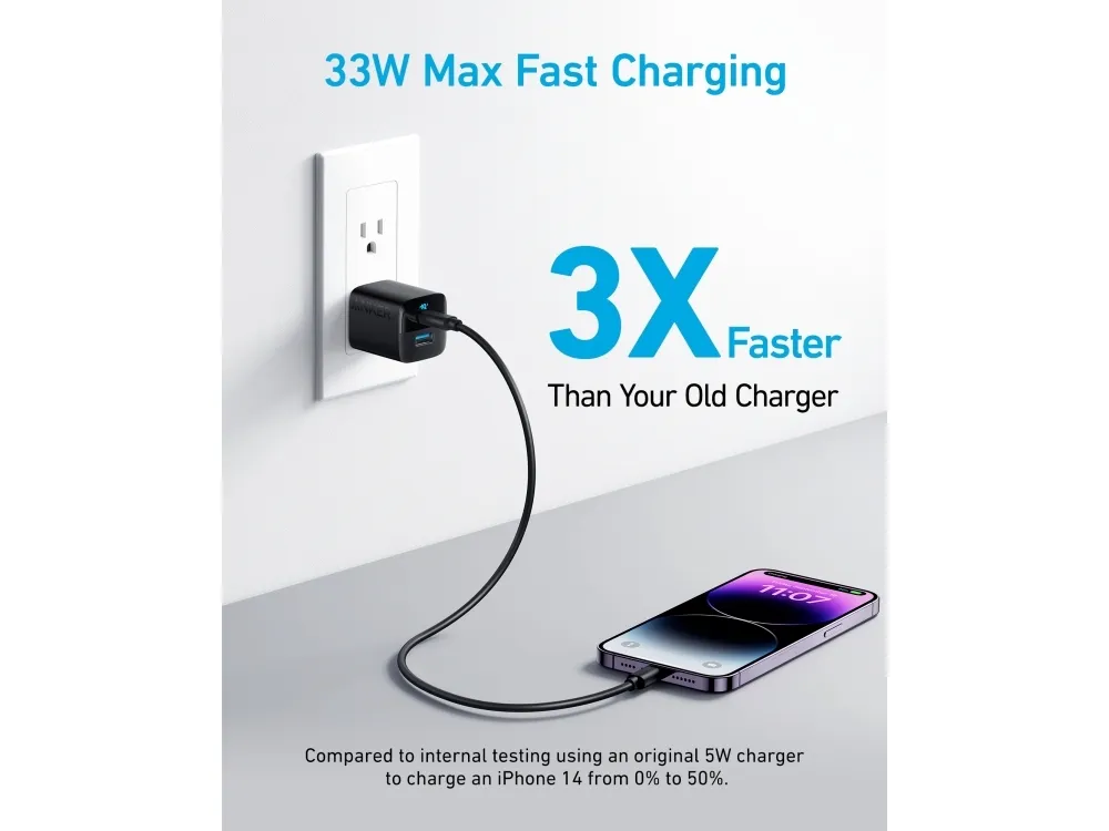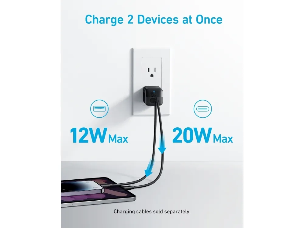 Discover the Anker 323, a power adapter designed to meet the charging needs of both cellular phones and tablets. This charger incorporates Power Delivery fast charge technology, ensuring your devices are powered up quickly and safely. With the inclusion of ActiveShield, the Anker 323 monitors temperature in real time, offering an added layer of protection for your devices. The charger features a foldable plug design, making it an ideal choice for those on the go. Whether at home or traveling, the Anker 323 provides reliable charging with its dual output connectors, including a 24-pin USB-C and a 9-pin USB Type-A, catering to a wide range of devices. With a 33 Watt power output, it's designed to accommodate your charging needs, ensuring your devices stay powered throughout the day.
