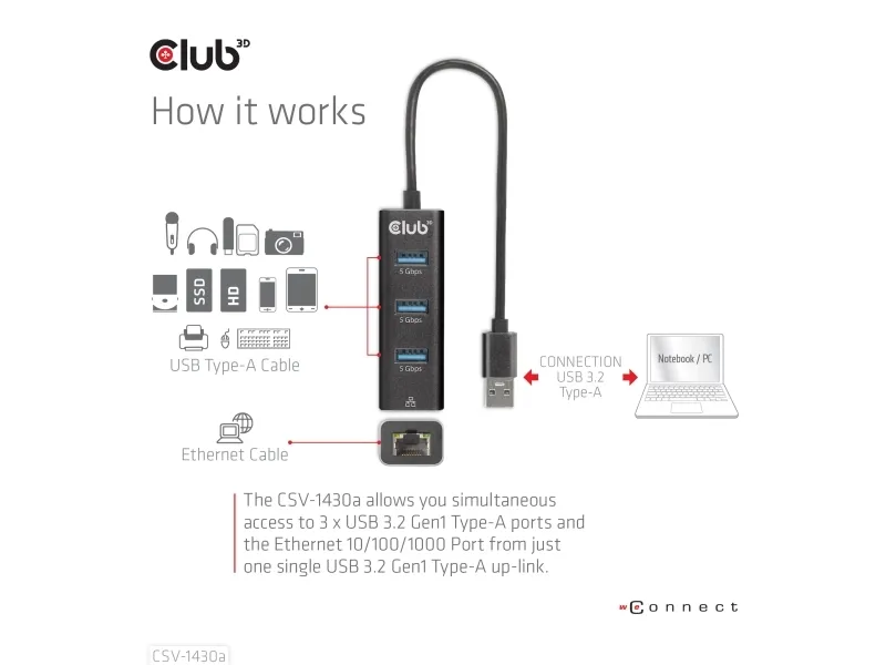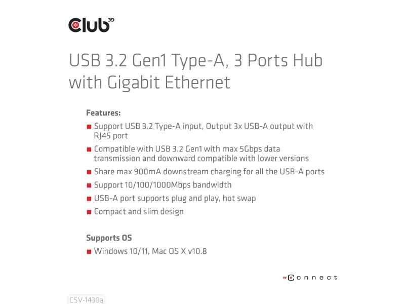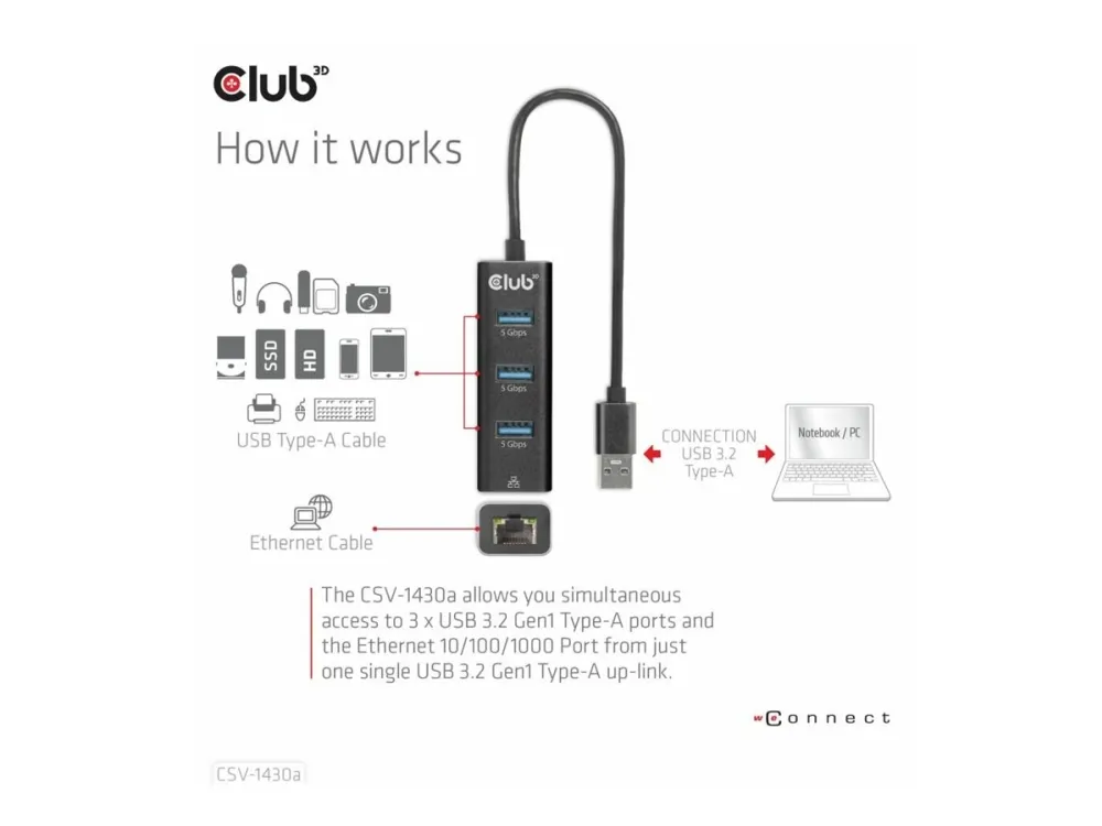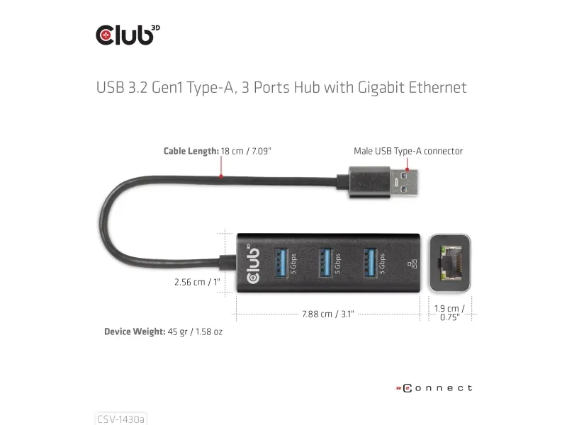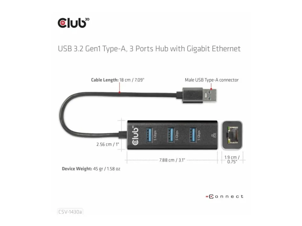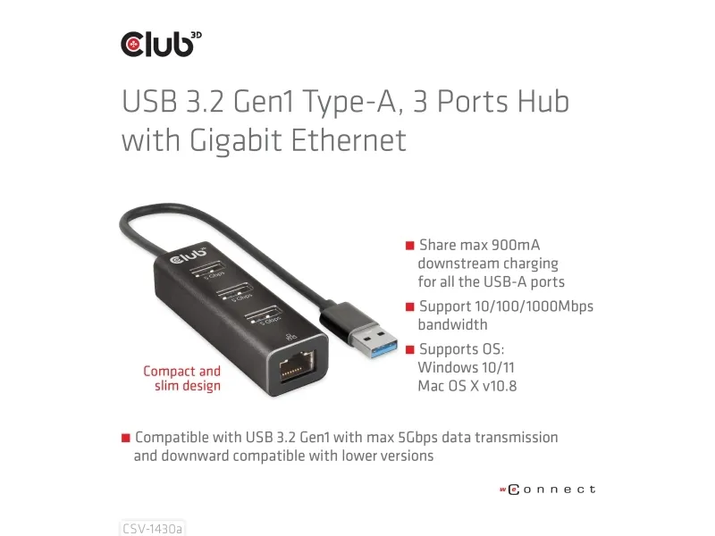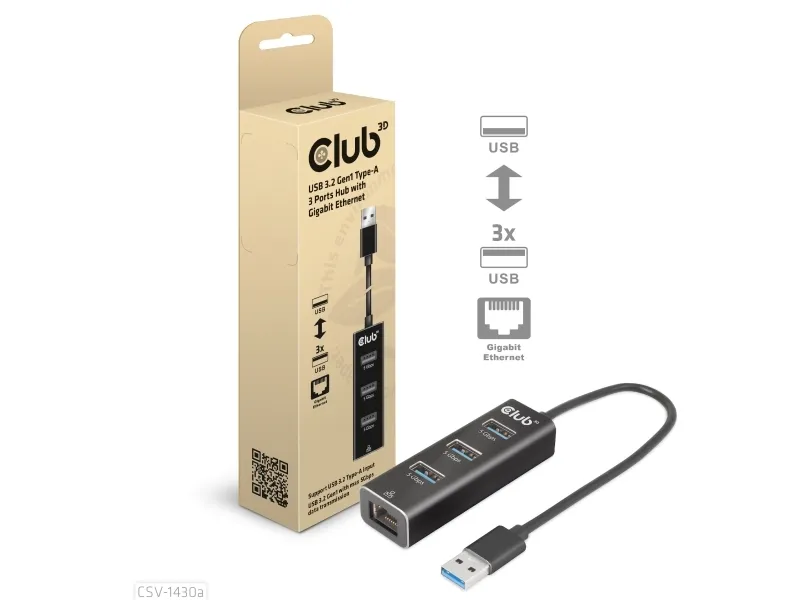 The Club 3D CSV-1430A is a versatile USB-C hub that combines functionality with a compact design, making it an essential device for any user seeking to expand connectivity options. This hub features multiple ports, including three USB 3.2 Gen 1 ports and one Gigabit LAN port, allowing seamless connections to various devices. With a length of 18 cm, this hub is portable and easy to use in various environments, whether at home or on-the-go. Its Plug-and-Play capability ensures a hassle-free experience, enabling hot swapping without needing to power down.