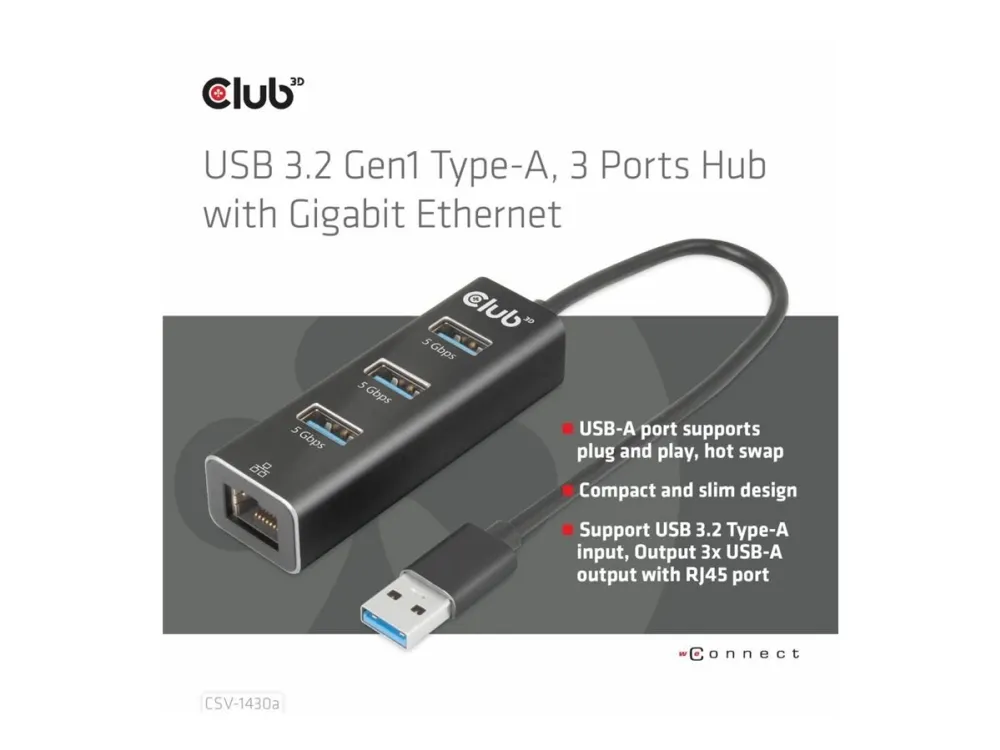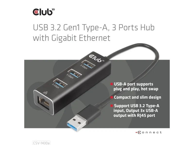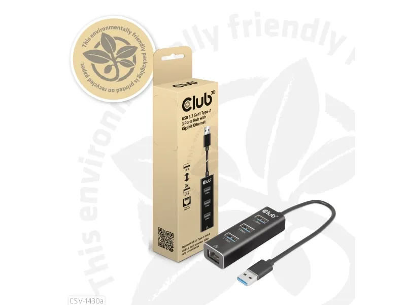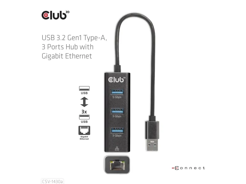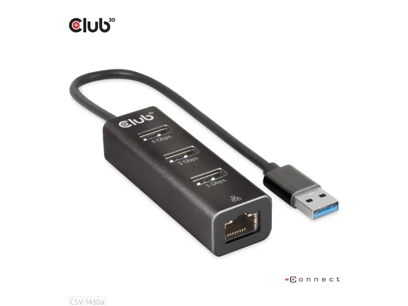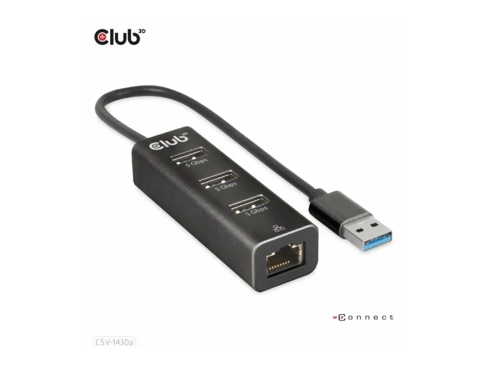 Club 3D CSV-1430A - Hubb - 3 x USB 3.2 Gen1 + 1 x 10/100/1000 - skrivbordsmodell