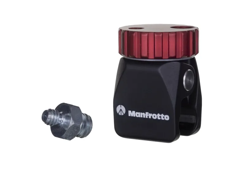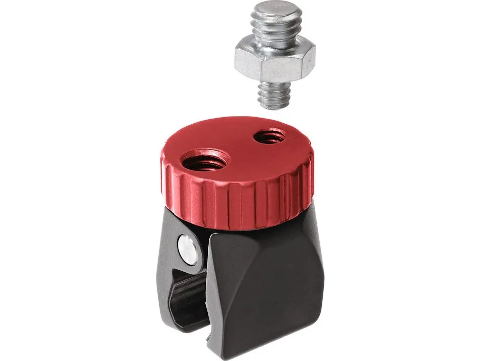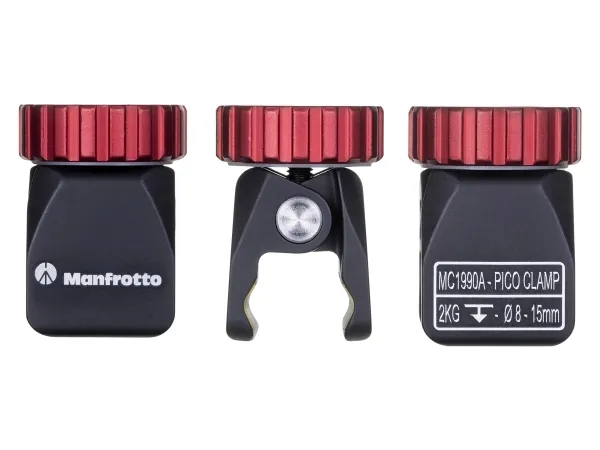 Manfrotto “Pico Clamp” is an extra-small clamp with versatile use. It is a great tool for mounting portable strobes, cameras, LED light panels, audio recorders, or just about any other piece of low-weight gear that comes equipped with standard 1/4'' or 3/8’’ attachments.\nManfrotto “Pico Clamp” helps the photographer and videographer to experiment new solutions, offering the possibility to safely attach the equipment to very thin bars, having a diameter from 8 to 15 mm.\nDespite being so compact, the clamp can hold a maximum payload of 2kg (4,4lbs) on vertical axis. Manfrotto Pico Clamp has a nice design and it is also extremely easy-to-use: to tighten the clip, just rotate the red knob. Set-up is done in few seconds.