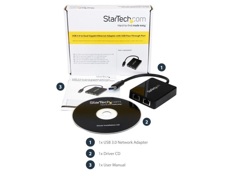 USB32000SPT USB 3.0-adaptern med två Gigabit Ethernet-portar låter dig lägga till två Gigabit Ethernet-portar till din bärbara dator eller Ultrabook genom en enda USB 3.0-port och har inbyggd USB 3.0-genomströmning som håller USB-porten tillgänglig för extern lagring eller andra tillägg. Varje RJ45-port stöder 10/100/1000 Mbps Ethernet och är kompatibel med standarderna IEEE 802.3i/u/ab.