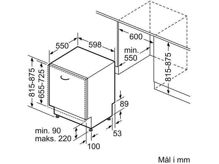 Nischmått när den är inbyggd (H x B x D): 815-875 x 600 x 550 mm
