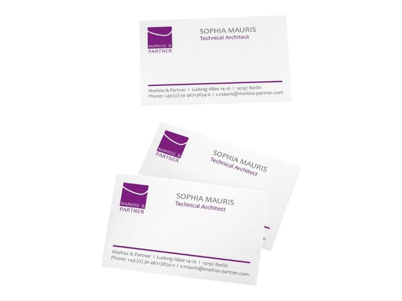 PC business cards, bright white, satin finish, 200 gsm, FSC-certified. The fast, simple way to design and print business cards with your own PC and printer. Ultra-fine microperforations make the cards simple to detach from the sheet and guarantee clean, precise edges. The business cards are extremely practical, e.g. for events, trade fairs or exchanging personal details, both in the professional and private sphere. Suitable for all inkjet and (colour) laser printers and copiers. The pack contains 60 A4 sheets for a total of 600 cards, 85x55 mm.