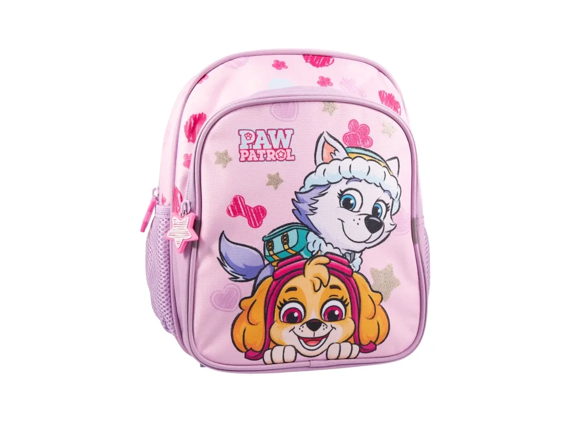 PAW PATROL GIRLS, Liten ryggsäck med 2 dragkedjefickor fram, 2 sidofickor i nät, reflexer på remmarna, vadderade axelremmar och bröstrem, 300D polyester med glittertryckta stjärnor, H 26,5 cm, B 21 cm, D 10 cm. Volym: 5 liter
