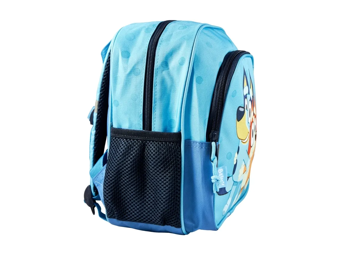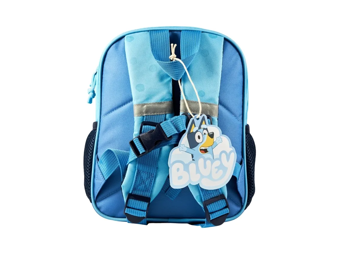BLUEY Blå liten ryggsäck med 2 dragkedjefickor fram, 2 sidofickor i nät, reflexer på remmarna, vadderade axelremmar och bröstrem, 300D RPET nylon, H 26,5 cm, B 21 cm, D 10 cm. Volym: 5 liter