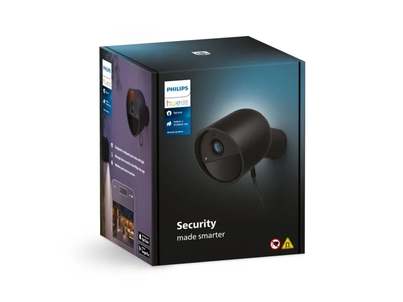 Philips Hue Secure-kameran ger sinnesfrid med sina tillförlitliga övervakningsfunktioner, utformade för både inomhus- och utomhusmiljöer. Med en digital videoinspelningsupplösning på 1080p säkerställer den tydliga och detaljerade bilder. Funktioner som mörkerseende, ljudlarm och rörelseaktiverade meddelanden ökar säkerheten under alla tider på dygnet. Den väderbeständiga designen, som uppfyller IP65-standarderna, innebär att den kan klara olika väderförhållanden.
