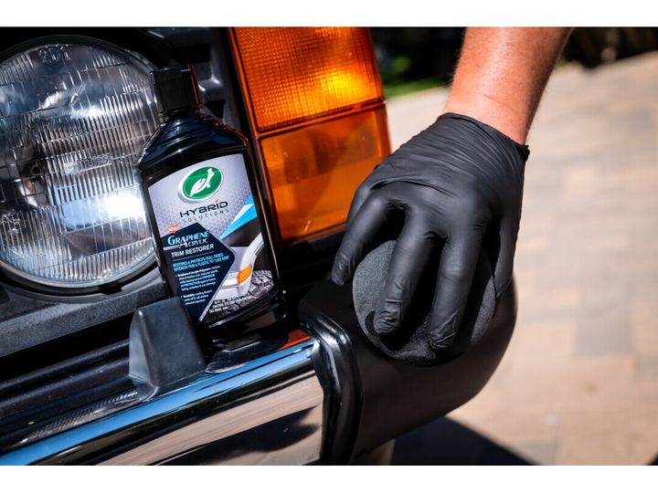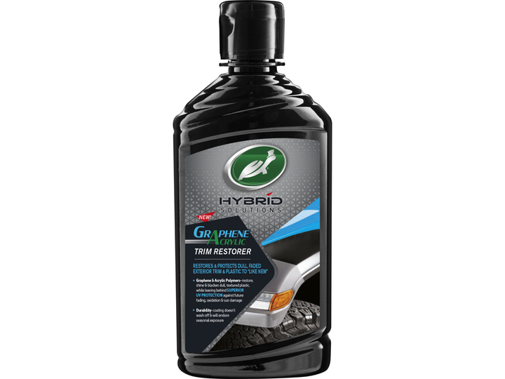 Graphene & Akryl polymerer återställer glansen och svärtan på bilens utvändiga olackerade plastdetaljer.