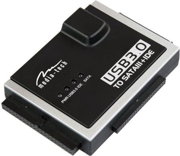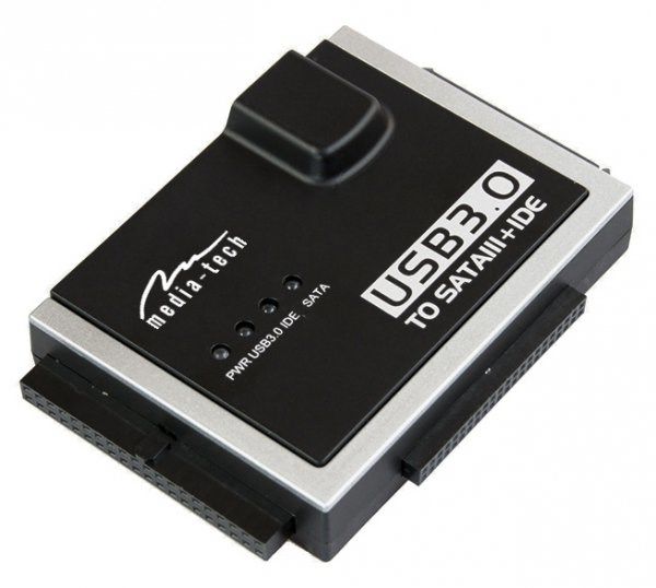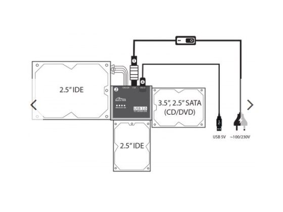 MT5100 is a multi-adapter for connecting all types of hard drives and optical drives with IDE and SATA interfaces to USB 3.0 port in your computer. You can connect maximum three devices at the same time and copy data between them. Manual switch on the power cable provides safe connecting and disconnecting devices.