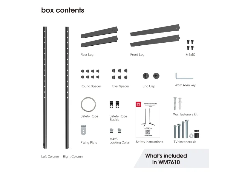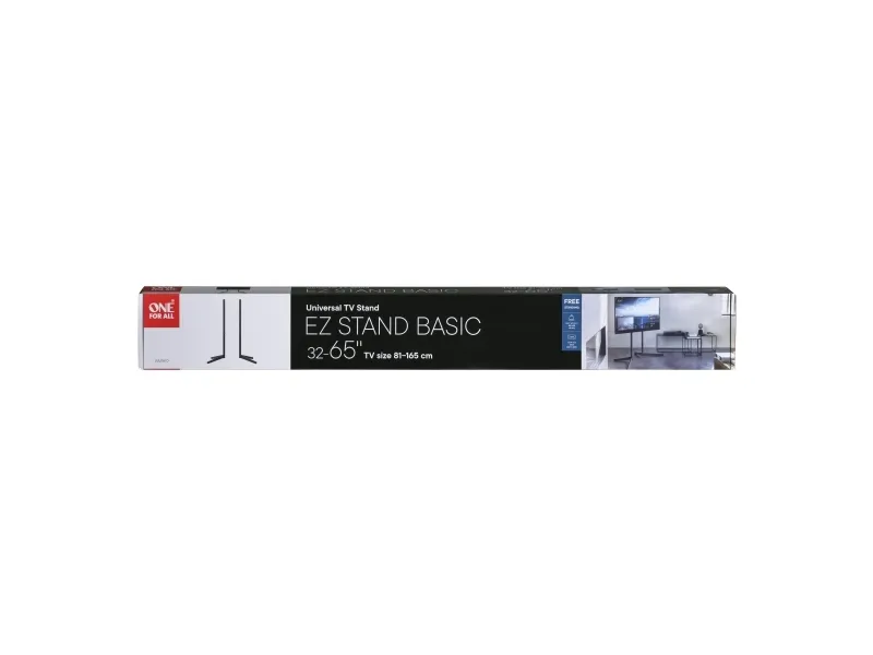 Our stylish TV Stand allows you to mount your 32”-65” TV without the need to drill holes. Enjoy the freedom of adjusting the height of your TV for a comfortable viewing experience. The EZ Stand will give a modern look to your interior and is easily repositioned to adjust the layout of your room. All mounting materials are delivered with the stand for a simple setup.One For All WM 7610. Maximum weight capacity: 40 kg, Minimum screen size: 81.3 cm (32"), Maximum screen size: 165.1 cm (65"), Minimum VESA mount: 200 x 200 mm, Maximum VESA mount: 600 x 400 mm. Product colour: Black