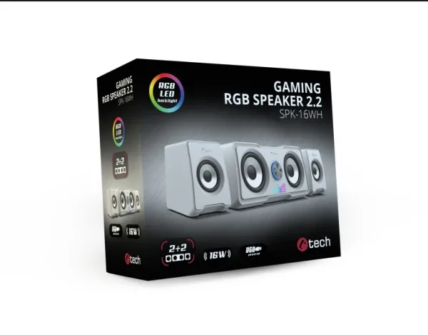 C-TECH spk-16wh. Audio output channels: 2.1 channels, RMS rated power: 16 W, Recommended usage: Universal. Amplification device form factor: Built-in. Front speaker type: 1-way, Front speakers RMS power: 6 W, Front speaker frequency range: 150 - 20000 Hz. Center speaker type: 1-way, Center speaker RMS power: 10 W, Center speaker frequency range: 150 - 20000 Hz. Power source: USB