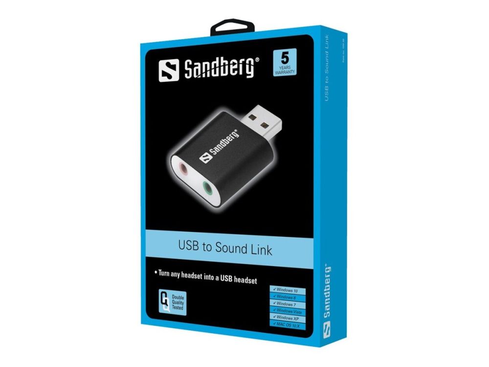 The Sandberg USB to Sound Link is a compact external USB sound card with connectors for both speakers and microphone. It allows you, for example, to connect an ordinary headset to your computer via a USB port without you having to disconnect any sound equipment already connected to the computer. This completely removes the need for complicated internal installations and gives you the freedom to move your external sound card around, for example between your desktop and laptop computers.