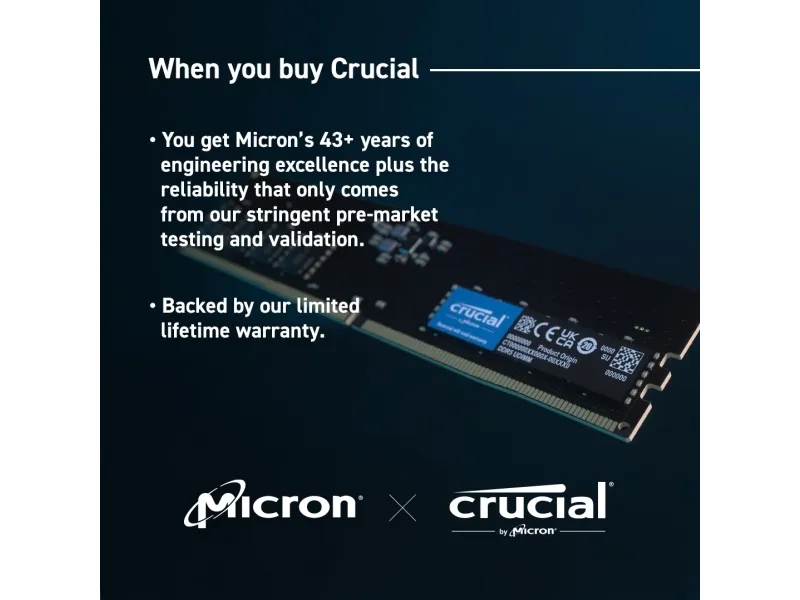 Crucial DDR5 Memory has the blazing speed and massive bandwidth needed for the next generation of multi-core CPUs. This advanced technology empowers your system to multitask better, load, analyze, edit, and render faster, game with higher frame rates, uncover data insights faster, enhance productivity to save time and money, significantly reduce lag for heavy workloads and optimize power efficiency over the previous generation. Available in speeds up to 5600 MT/s, Crucial DDR5 Memory can enable your computer to harness performance that was once only possible with extreme performance memory.