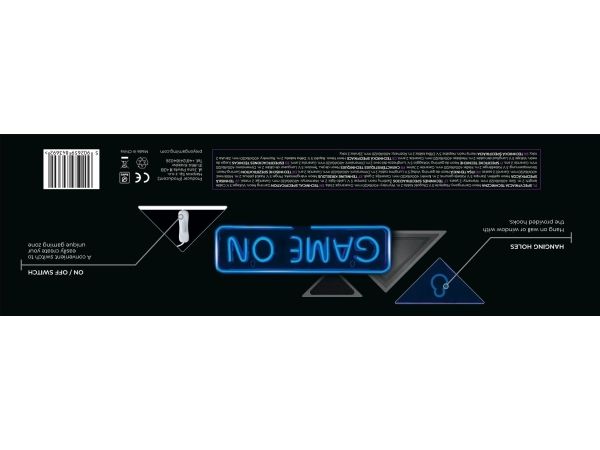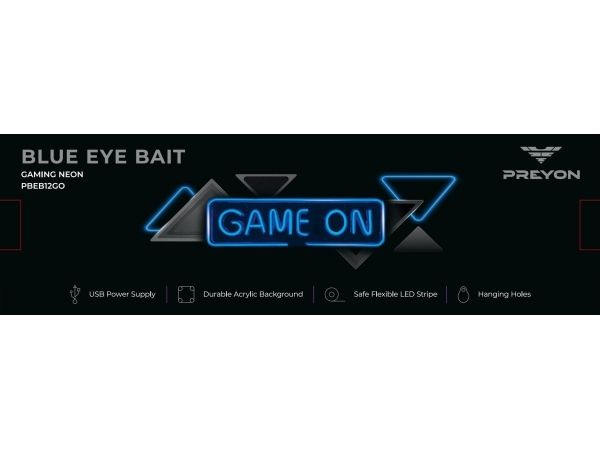 PREYON har säkerställt enkel installation av Blue Eye Bait med texten "Game On". Skylten kan hängas på vägg eller fönster med de medföljande krokarna. Detta gör att du enkelt kan ändra placering när du vill fräscha upp din gaming-hörna.